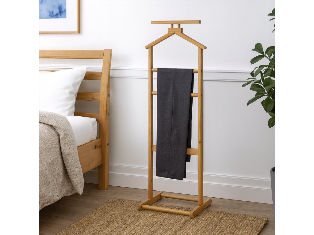 Bambusový stojan na oblečenie o rozmere 30x32x102 cm.
