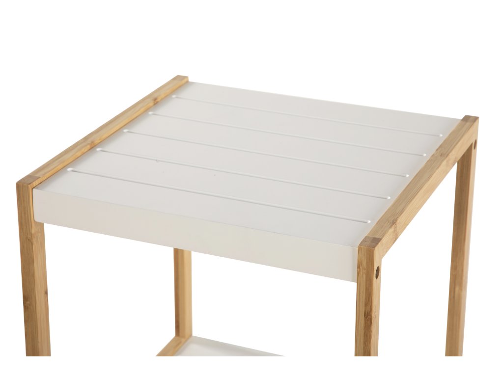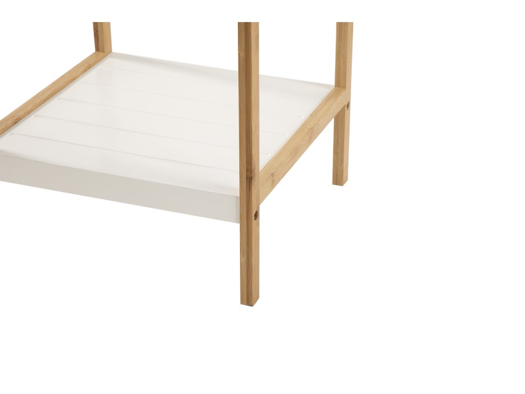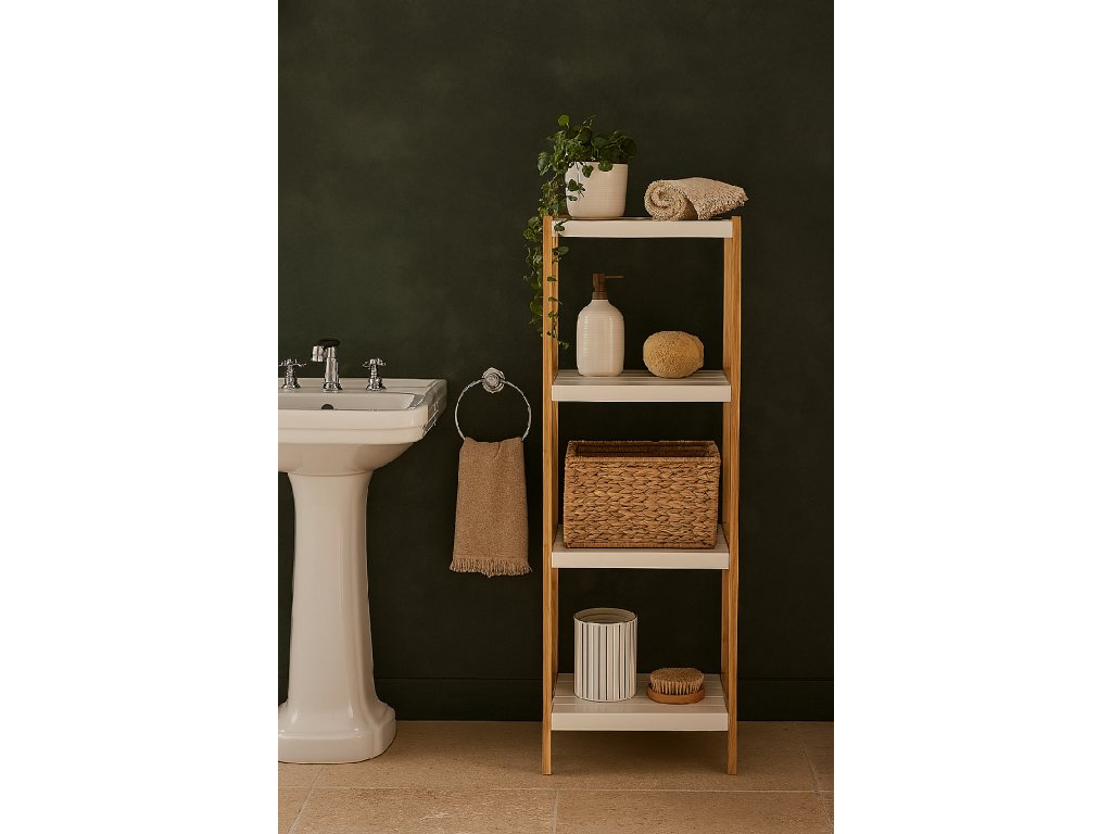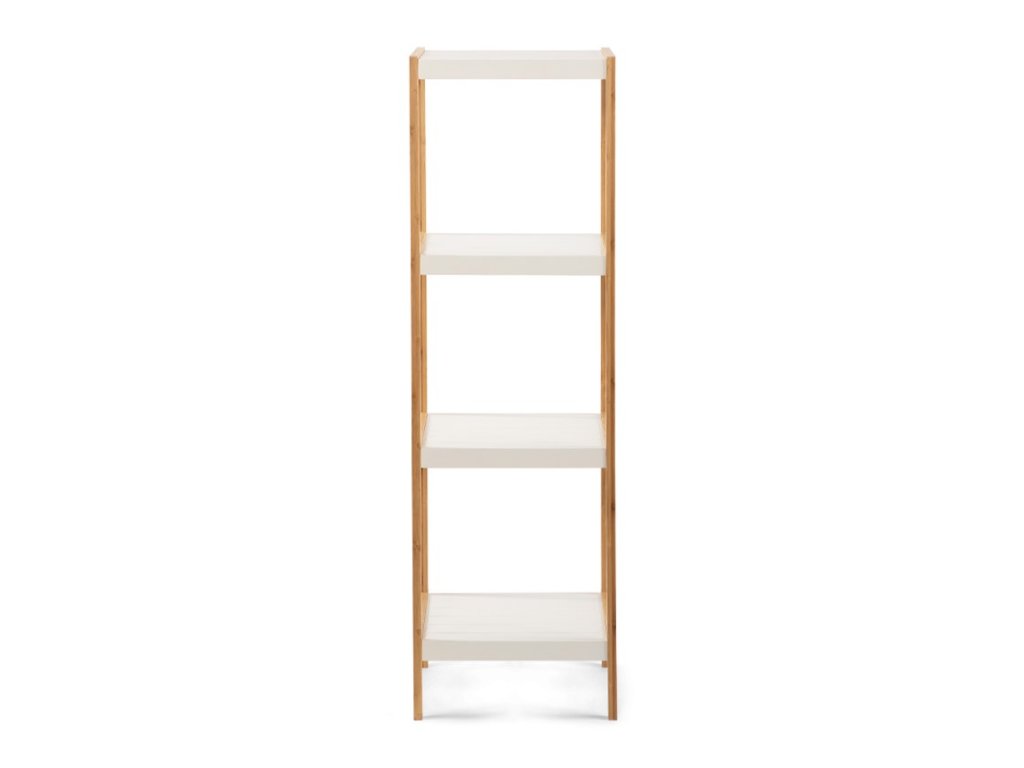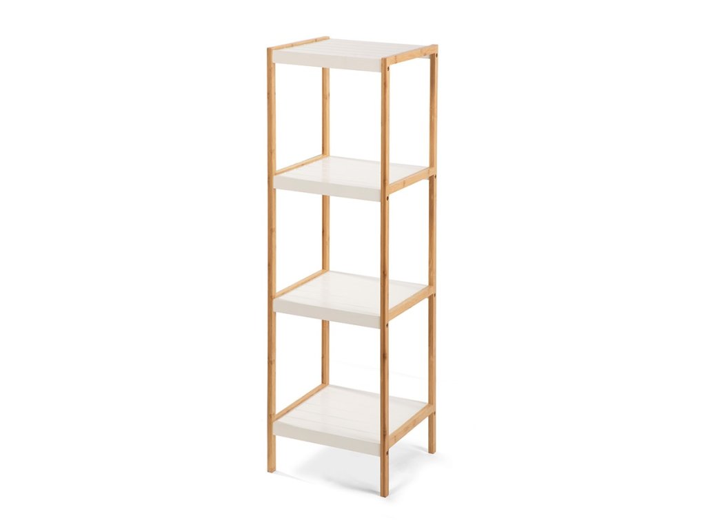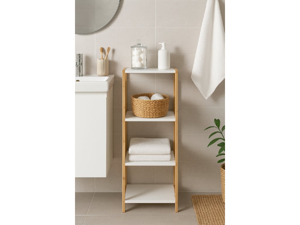 Moderný policový diel so štyrmi úložnými policami. Kombinácia prírodného bambusového rámu a bielych políc pôsobí elegantne a vzdušne. Stabilná konštrukcia vhodná na každodenné používanie. Praktické využitie na uloženie uterákov, kozmetiky, kníh alebo dekorácií. Hodí sa do kúpeľne, spálne, obývacej izby aj predsiene. Jednoduchý design, ktorý ľahko zapadne do rôznych interiérov.