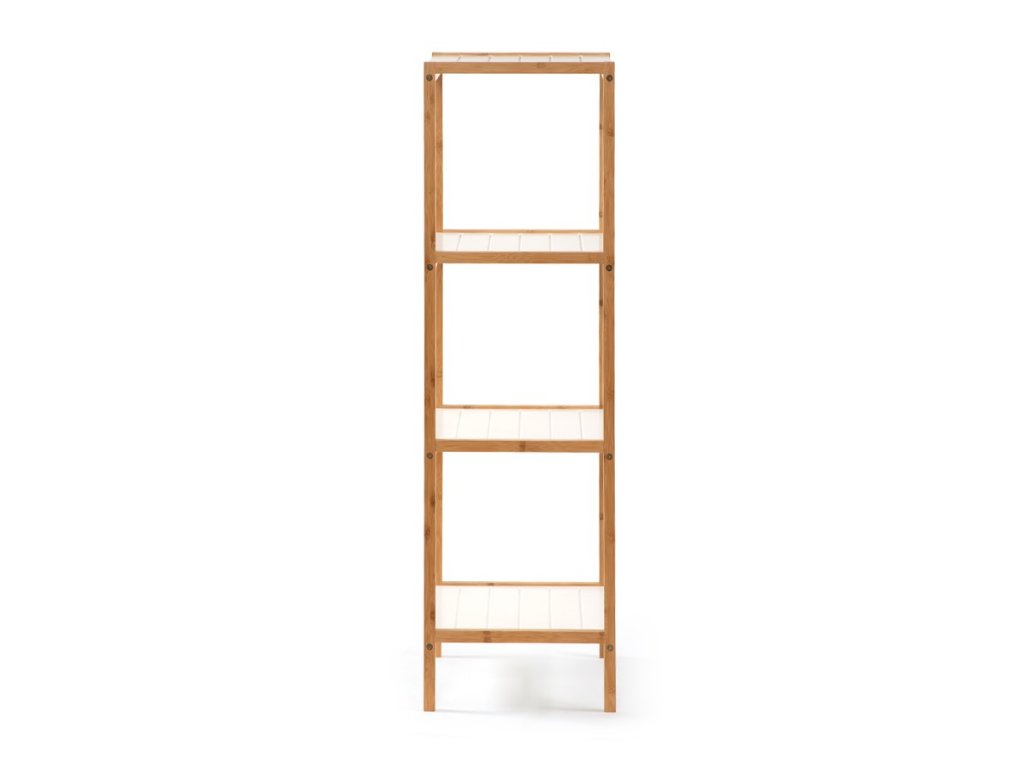 Bambusový regál s bielymi policami o rozmere 34x33x110 cm.