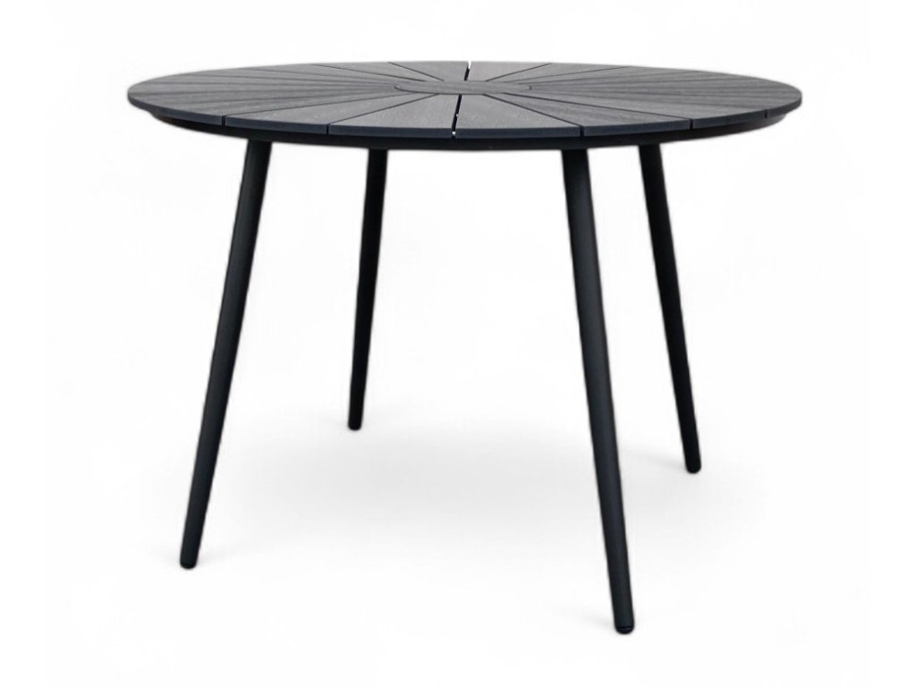 Hľadáte menší jedálenský stôl na Vašu záhradu a nezaujali Vás tradičné a okukané štvorcové a obdĺžnikové stoly? Krásny záhradný jedálenský stôl WILDER s okrúhlou stolovou doskou s priemerom 105 cm bude vynikajúcou voľbou! Konštrukcia stola je vyrobená z ocele ošetrenej proti hrdzi. Čierna stolová doska z umelého dreva verne imituje štruktúru a vzhľad dreva. Výhodou artwood, teda umelého dreva, je jeho odolnosť voči vonkajším vplyvom. Stôl môžete ponechať vonku a nemusíte si robiť starosti s jeho upratovaním. Ani po niekoľkých sezónach nestratí svoj pôvodný vzhľad a stabilitu. K stolu WILDER pohodlne umiestnite 4 stoličky a využijete ho predovšetkým na menších záhradách alebo terasách.