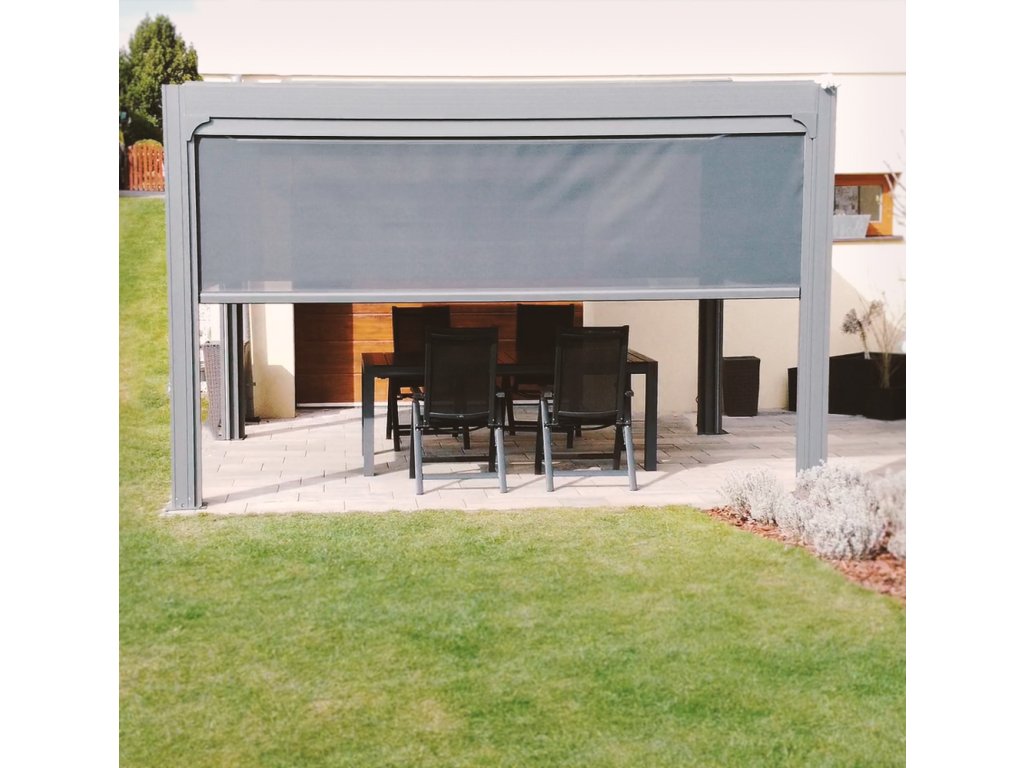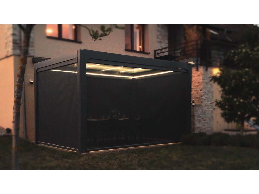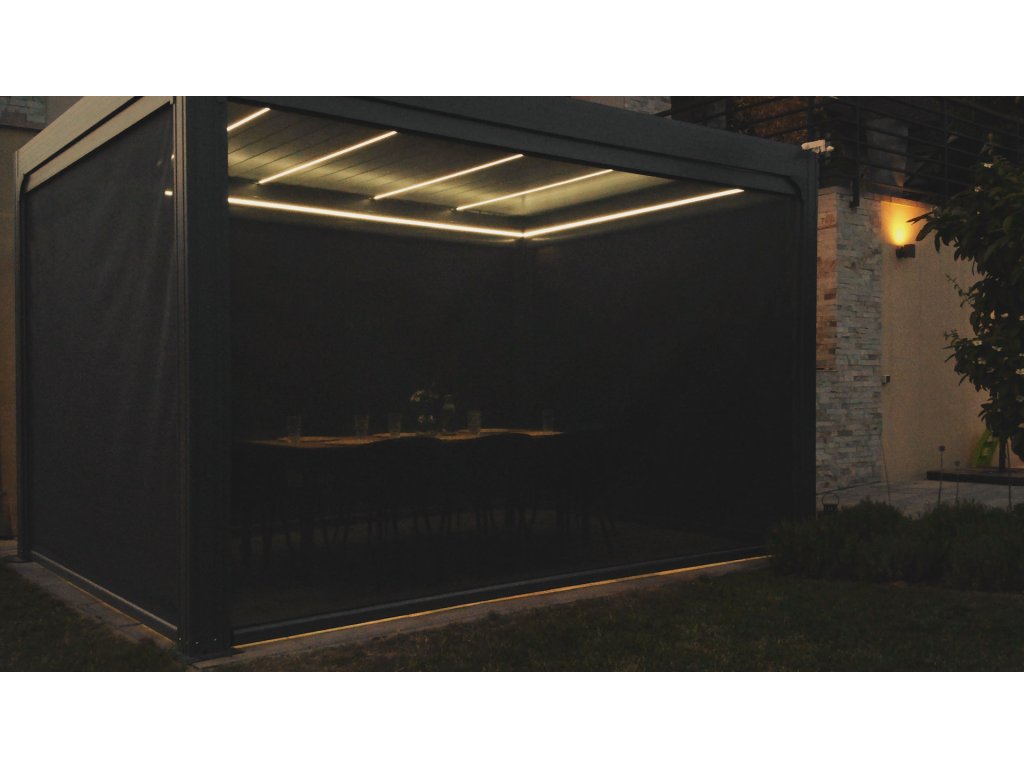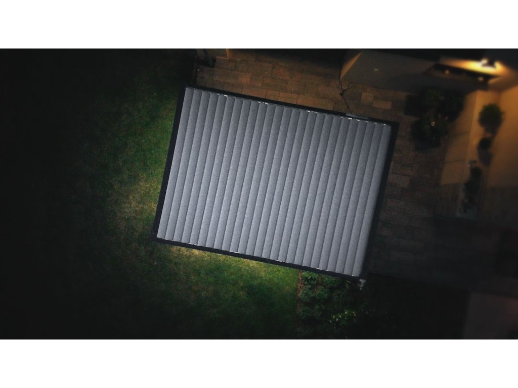 Pergola disponuje štyrmi screenovými roletami po stranách. Sťahovanie roliet rovnako ako ostatné funkcie pergoly je možné ovládať pomocou diaľkového ovládača, ktorý je súčasťou balenia. Naklápanie 25 lamiel na streche pergoly a stiahnutie screenových roliet zaistí zabudované elektromotory. Manipulácia je teda veľmi jednoduchá a nenáročná. Súčasťou je aj LED osvetlenie namontované v 4 lamelách, ktoré rozsvietite aj pohodlne na diaľku ovládačom. Použité materiály odolávajú poveternostným vplyvom.