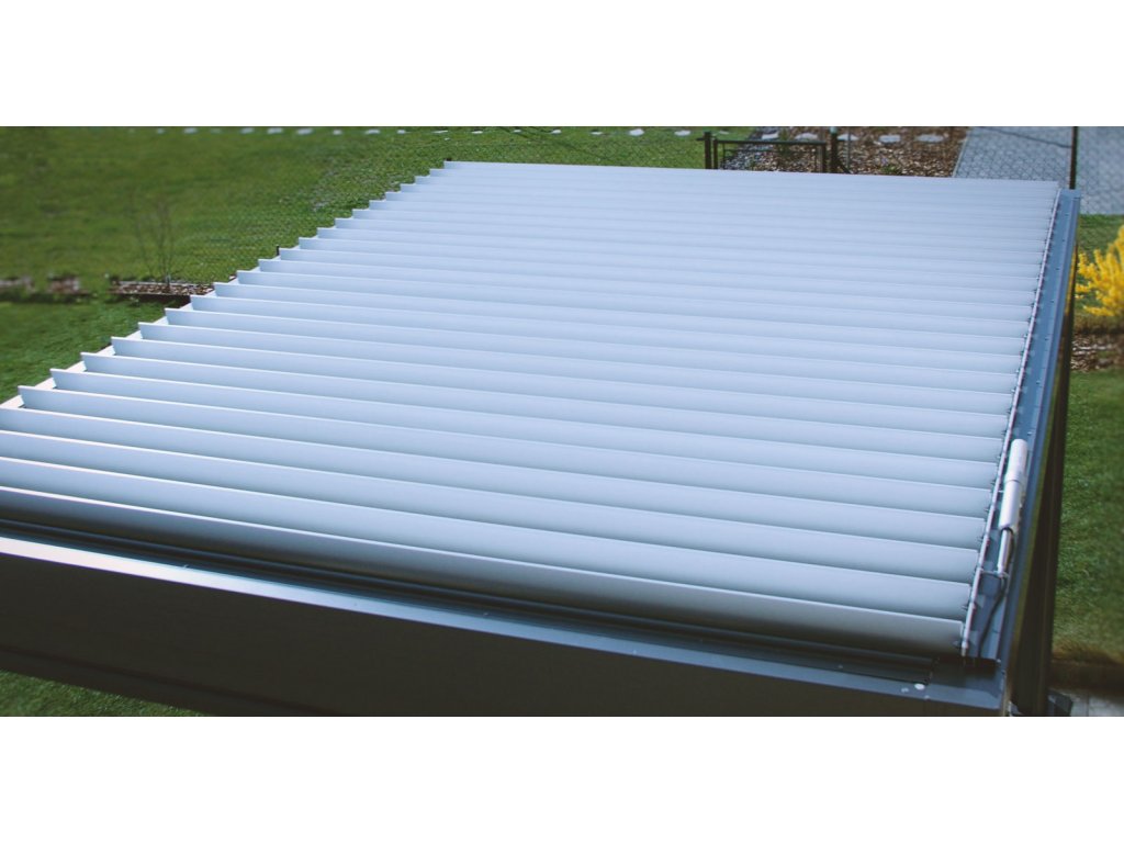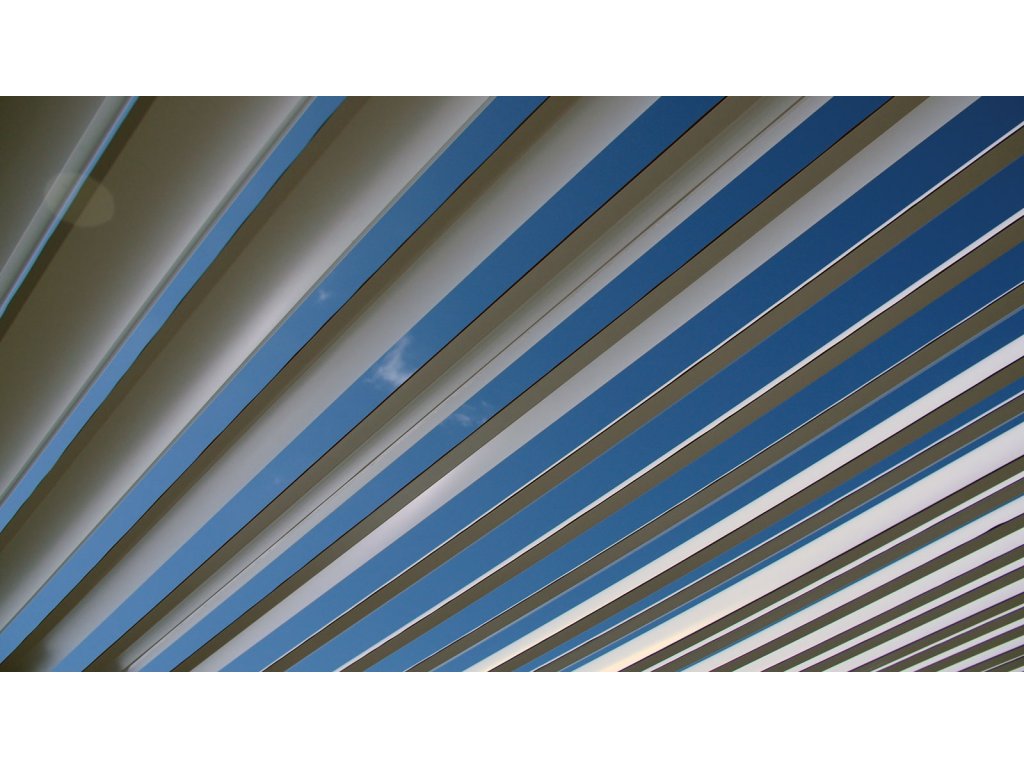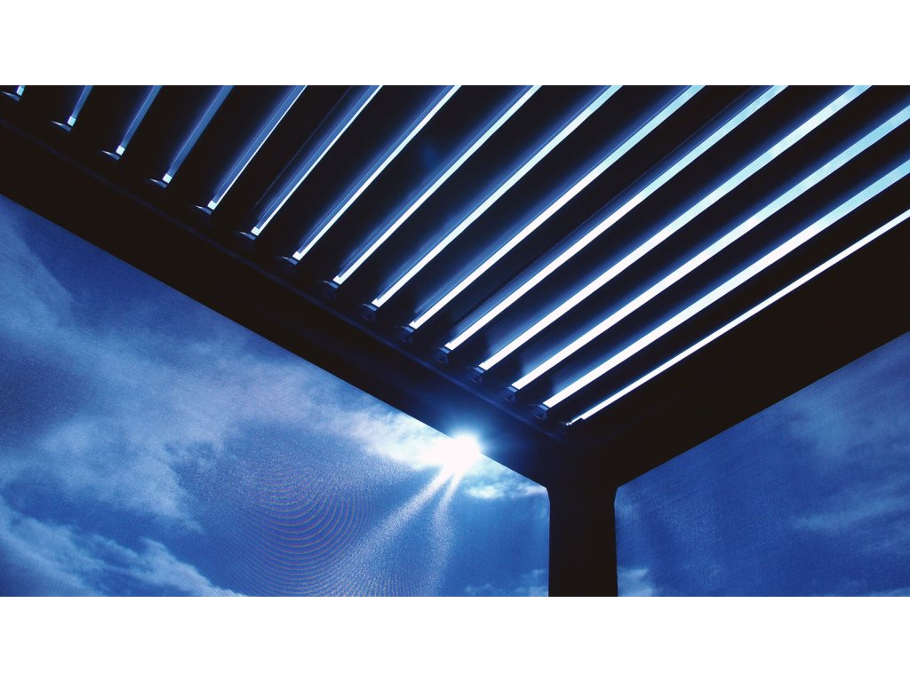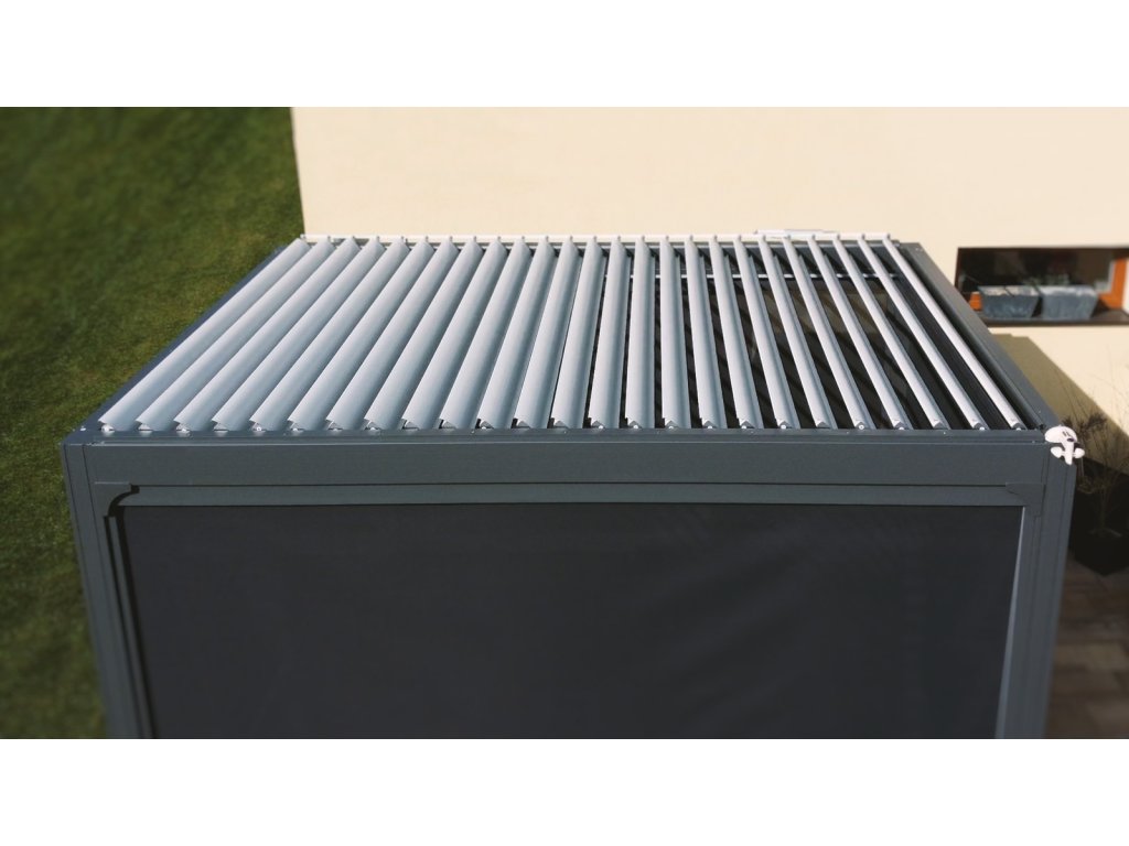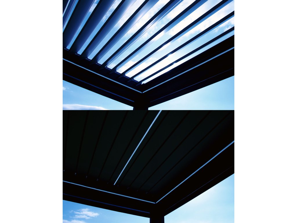 2. Nastaviteľné lamely na streche pergoly naklopíte pomocou elektromotorov pohodlne diaľkovým ovládačom, ktorý môžete mať pri sebe. Žiadne otáčanie kľučkou ako pri lacnejších modeloch. Lamely chránia pred slnkom a dažďom.