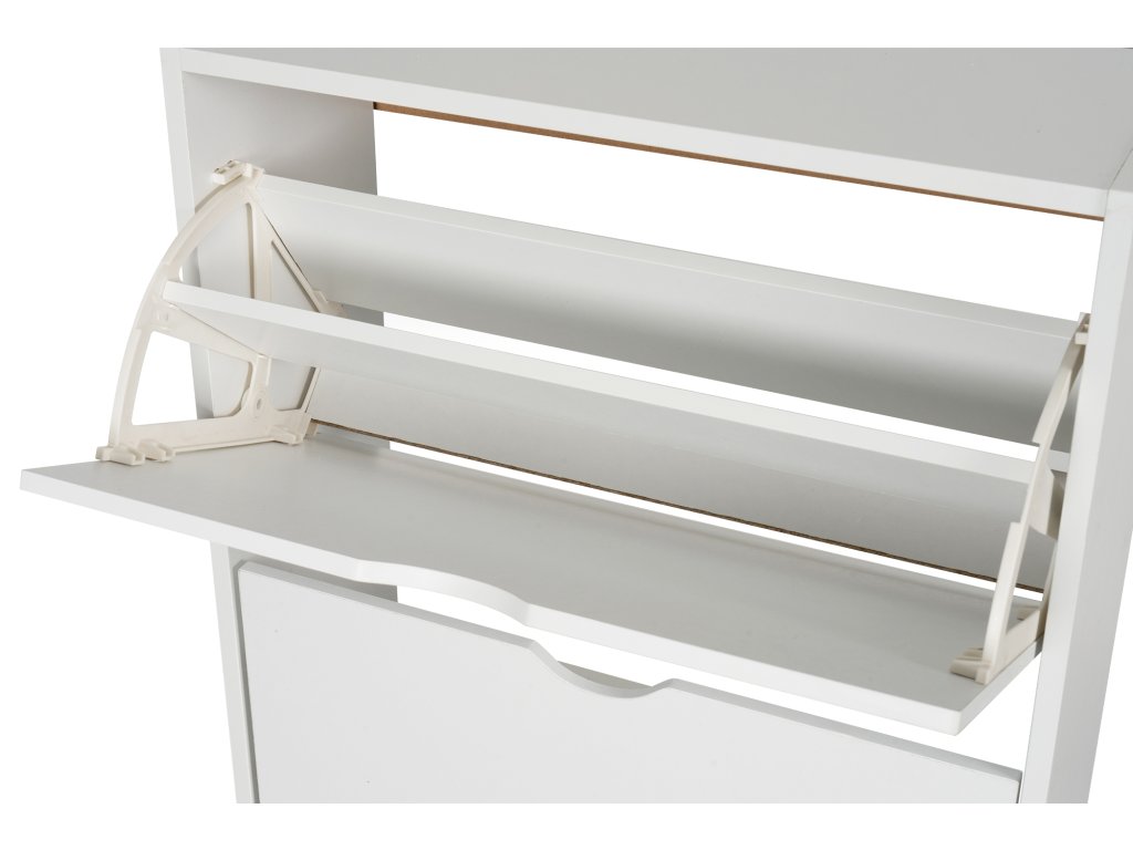 Botník s kompaktným a úzkym dizajnom bude ideálny do menších priestorov. Botník z preglejky ponúka štyri výklopné úložné priestory na obuv. Priehradky na topánky otvoríte jednoducho pomocou výrezov namiesto úchytiek. Stabilná konštrukcia v bielej farbe určená na každodenné používanie. Moderný a minimalistický vzhľad bude vhodný do predsiene alebo chodby.