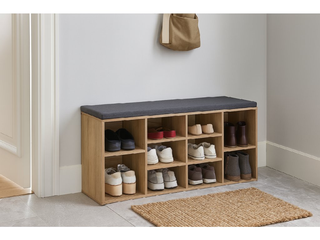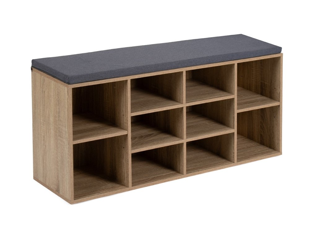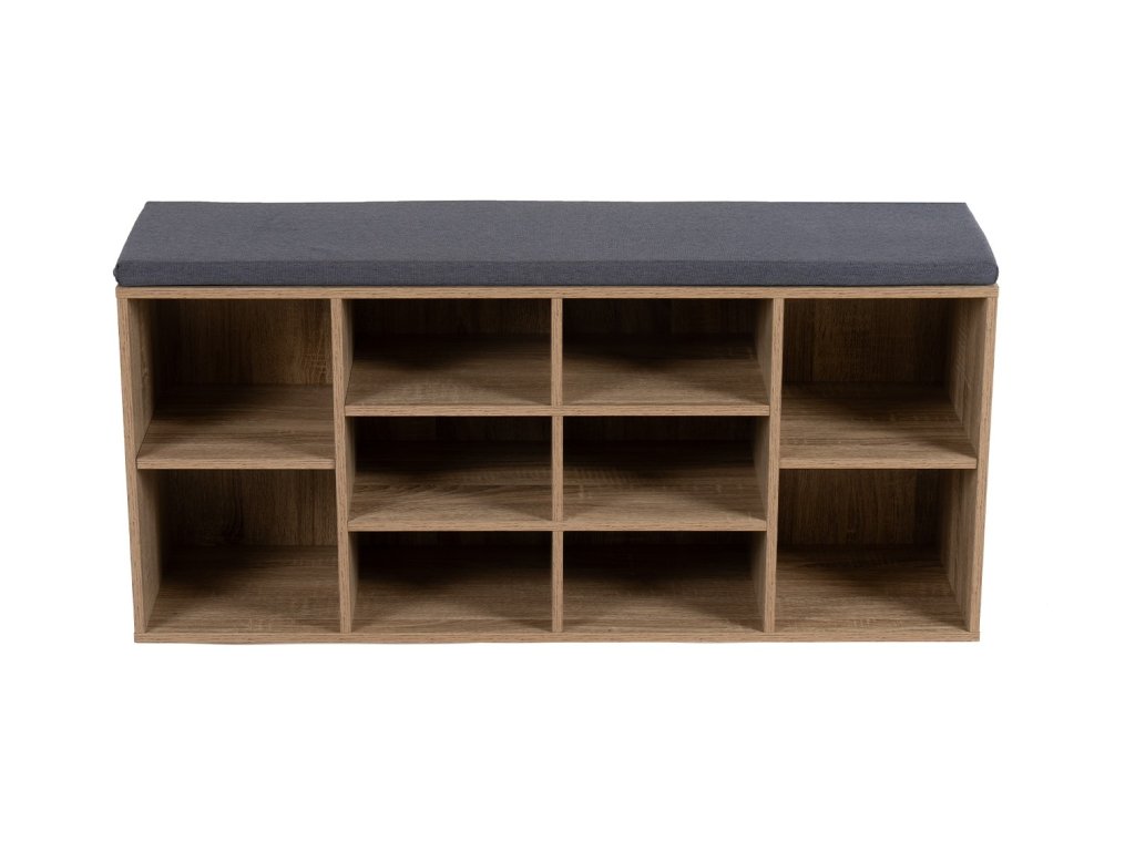 Praktický botník disponuje polstrovaným sedákom v šedej farbe pre pohodlné obúvanie. Do priestranných priehradiek uložíte obuv a doplnky. Otvorený dizajn umožňuje ľahký prístup a dobré vetranie topánok. Stabilná a odolná konštrukcia z MDF v prírodnej farbe je určená na každodenné používanie. Vhodný do predsiene či chodby, kombinuje funkciu úložného priestoru a lavice.