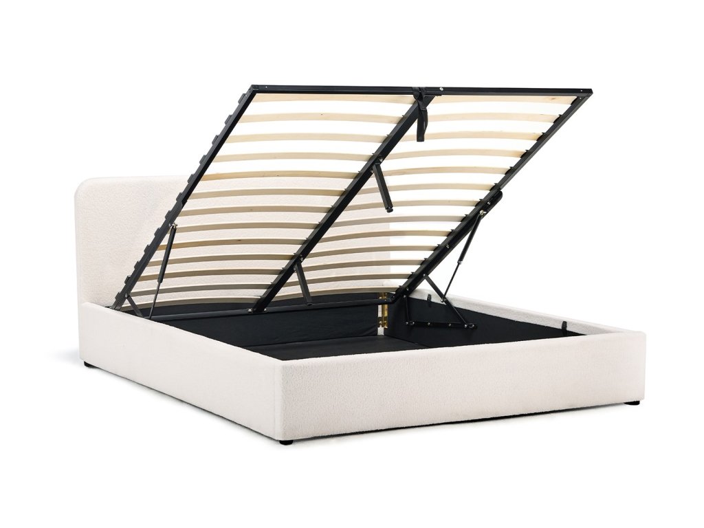 Čalúnená posteľ s úložným priestorom, preglejka s penovou výplňou a buklé poťahom, oceľový rám s hydraulickým zdvíhaním.