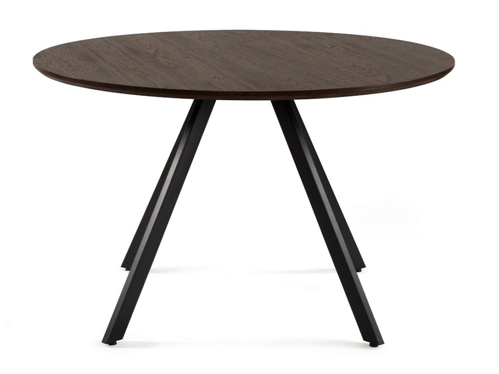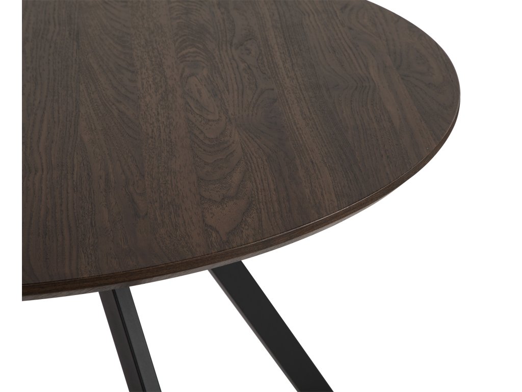 Okrúhly jedálenský stôl s priemerom 120 cm s moderným dizajnom. Hnedá doska stola v tmavom dekore dreva bola vyrobená z drevovláknitej dosky MDF. Ide o cenovo dostupnejší materiál ako masívne drevo. Stabilná kovová podnož v čiernom prevedení zaisťuje pevnosť a odolnosť. Kombinácia tmavo hnedého dekoru dosky a nôh z kovu v čiernej farbe dodáva interiéru elegantný a útulný vzhľad. K stolu umiestnite pohodlne 4 stoličky. Použité materiály nevyžadujú zvláštnu údržbu. Stačí utrieť vlhkou handričkou.