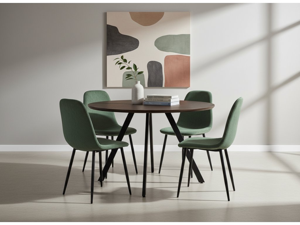 Jedálenskú zostavu tvorí Okrúhly jedálenský stôl v dekore hnedého dreva GYRUS 120 a 4x Menčestrová jedálenská stolička MARIE zelená.
