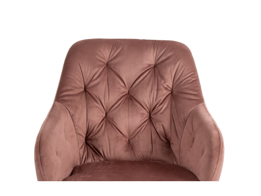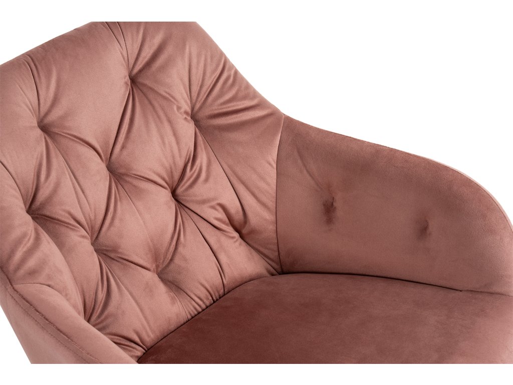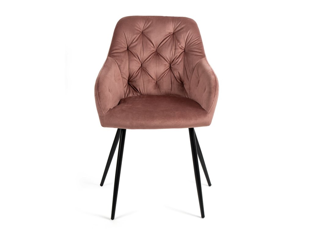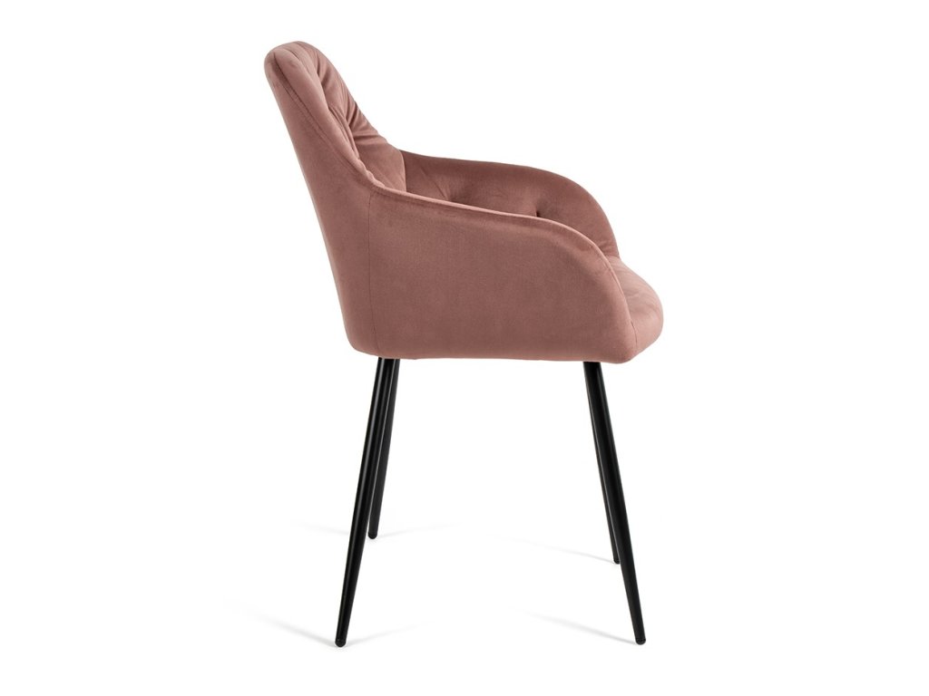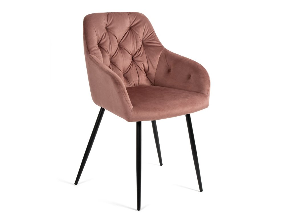 Jedálenský stôl dopĺňajú elegantné stoličky s podrúčkami, ktoré prinesú do interiéru moderný dizajn. O vaše pohodlie sa postará komfortné čalúnenie v ružovom zamate s dekoratívnym prešívaním. Pevné kovové nohy v čiernom prevedení dodajú stoličke patričnú stabilitu.