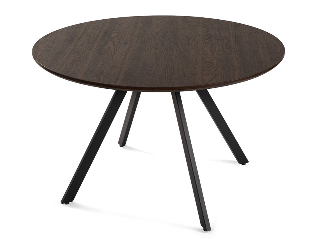 Okrúhly jedálenský stôl s priemerom 120 cm s moderným dizajnom. Hnedá doska stola v tmavom dekore dreva bola vyrobená z drevovláknitej dosky MDF. Ide o cenovo dostupnejší materiál ako masívne drevo. Stabilná kovová podnož v čiernom prevedení zaisťuje pevnosť a odolnosť. Kombinácia tmavo hnedého dekoru dosky a nôh z kovu v čiernej farbe dodáva interiéru elegantný a útulný vzhľad. K stolu umiestnite pohodlne 4 stoličky. Použité materiály nevyžadujú zvláštnu údržbu. Stačí utrieť vlhkou handričkou.