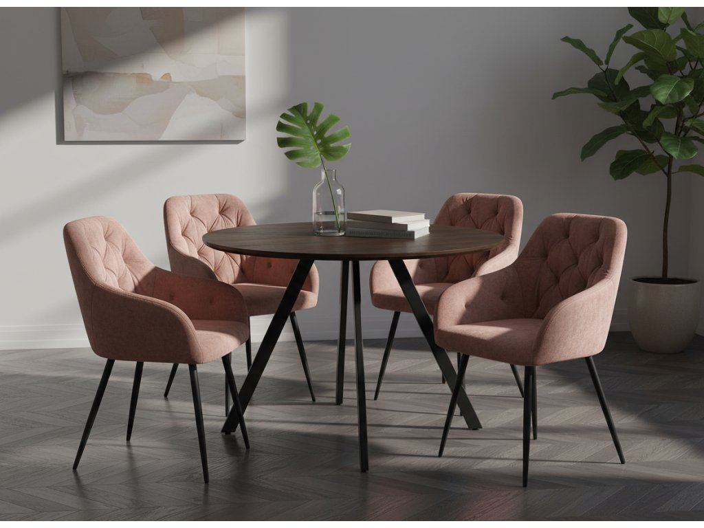 Jedálenskú zostavu tvorí Okrúhly jedálenský stôl v dekore hnedého dreva GYRUS 120 a 4x Zamatová jedálenská stolička SIENA ružová.