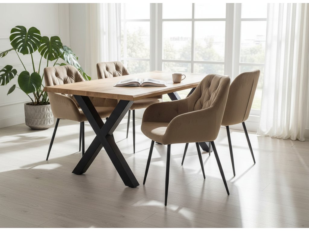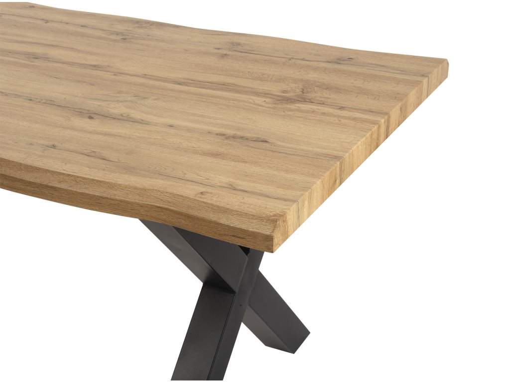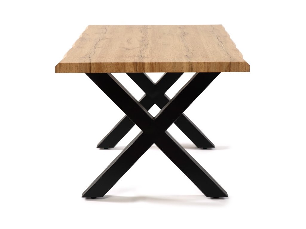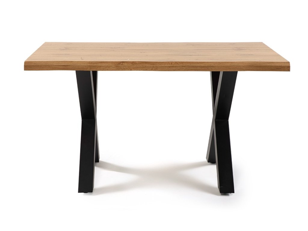 Obdĺžnikový jedálenský stôl s rozmermi 140 x 90 cm prináša moderný industriálny dizajn. Priestranná doska stola z MDF je vyvedená v prírodnom dekóre dreva s výraznou kresbou. Moderný vzhľad stola umocňuje robustná kovová podnož v čiernom prevedení v tvare „X“. Nosnosť stola je až 100 kg. Použité materiály nevyžadujú zvláštnu údržbu. Stôl stačí utrieť vlhkou handričkou. Stôl je vhodný do priestrannej jedálne či modernej kuchyne.