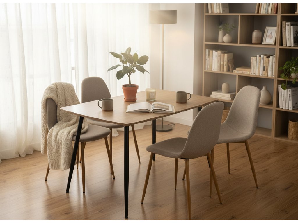 Jedálenskú zostavu tvorí Jedálenský stôl prírodný dekor s čiernou podnožou VILIS 120 a 4x Látková jedálenská stolička MARIE béžová.