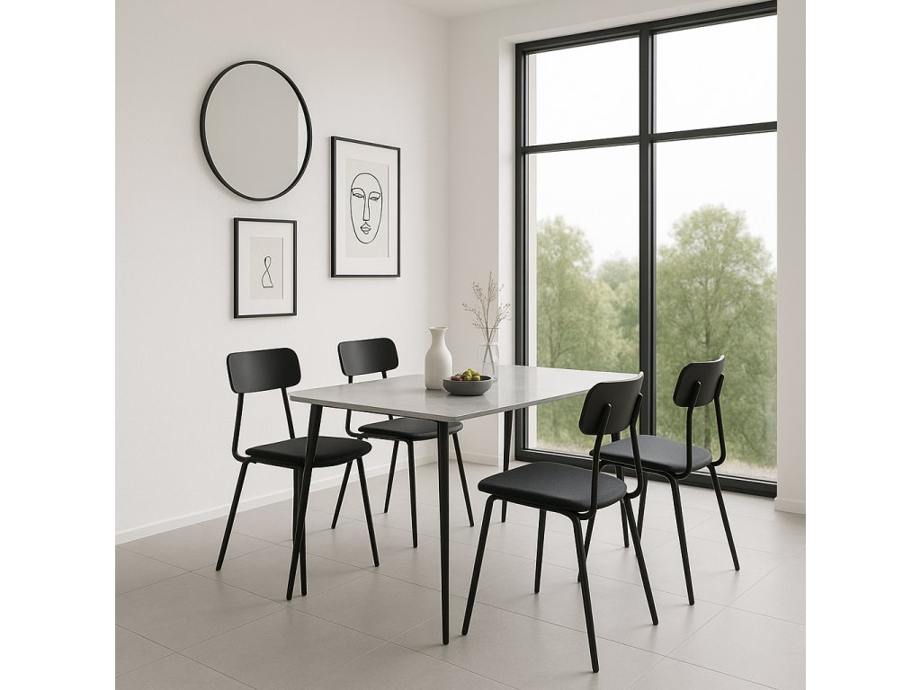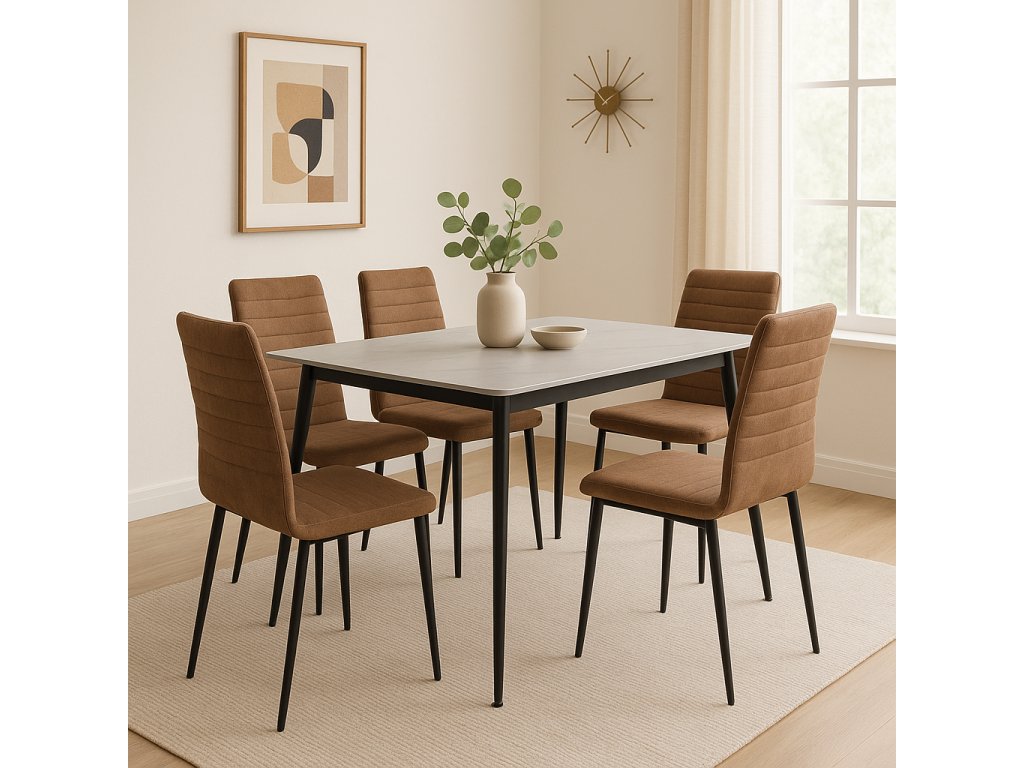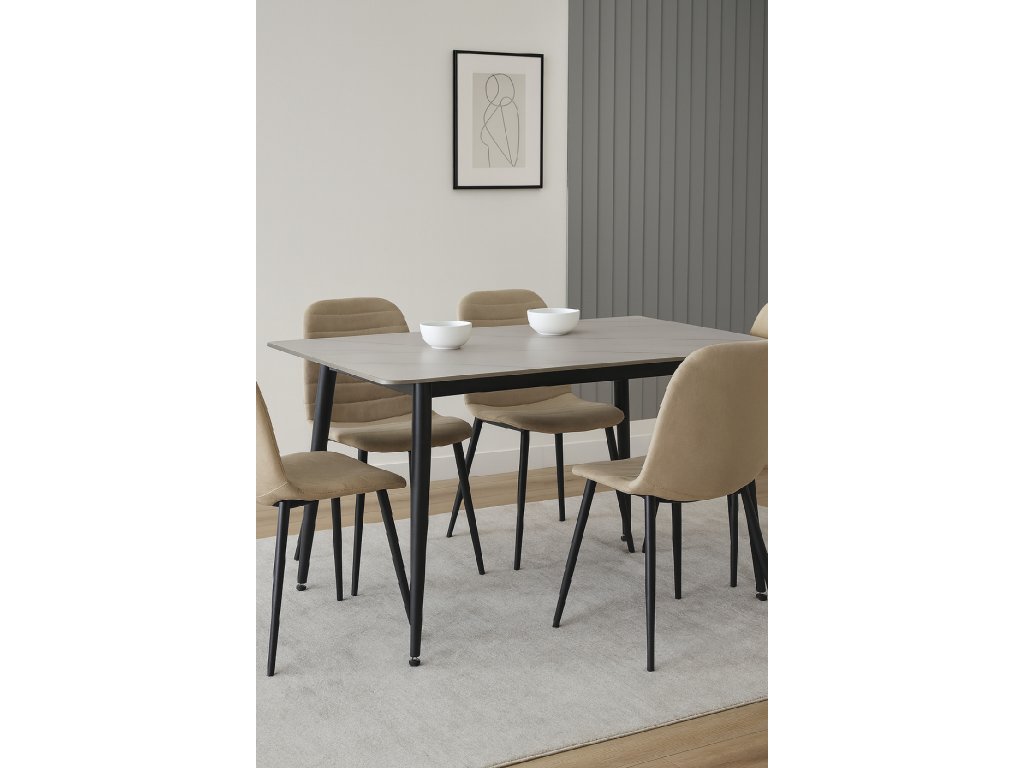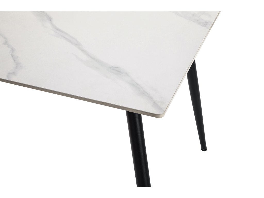 Obdĺžnikový jedálenský stôl s rozmermi 120 x 80 cm prináša moderný minimalistický dizajn. Keramická doska stola je vyvedená v dekore mramoru v bielej farbe. Elegantný vzhľad stola umocňujú stabilné kovové nohy v čiernom prevedení. Kombinácia mramorového dekoru dosky v bielej farbe s čiernymi nohami stola pôsobí luxusne a nadčasovo. K stolu pohodlne umiestnite 6 stoličiek. Použité materiály nevyžadujú zvláštnu údržbu. Stôl stačí utrieť vlhkou handričkou. Stôl je vhodný do modernej jedálne, kuchyne aj menších interiérov.
