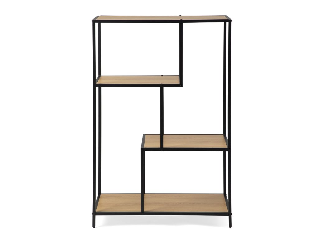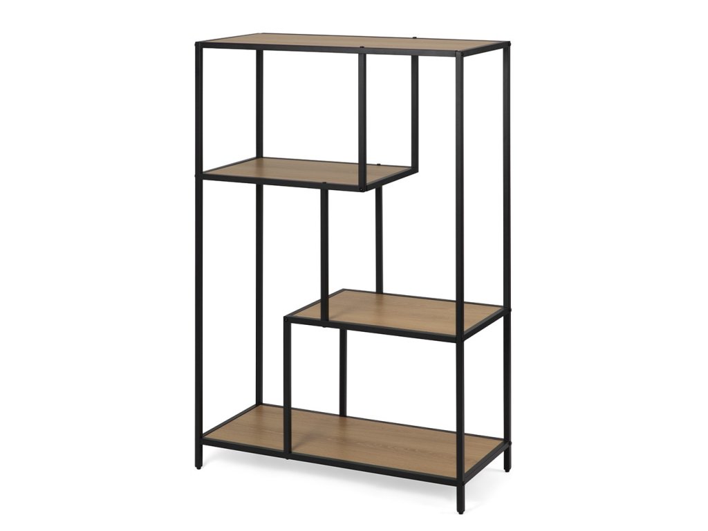 Praktický otvorený regál s kovovým rámom a policami v dekore prírodného dreva ponúka funkčný úložný priestor s odľahčeným vzhľadom. Vďaka asymetrickému rozloženiu políc pôsobí zaujímavo a zároveň poskytuje miesto na knihy, dekorácie alebo doplnky.