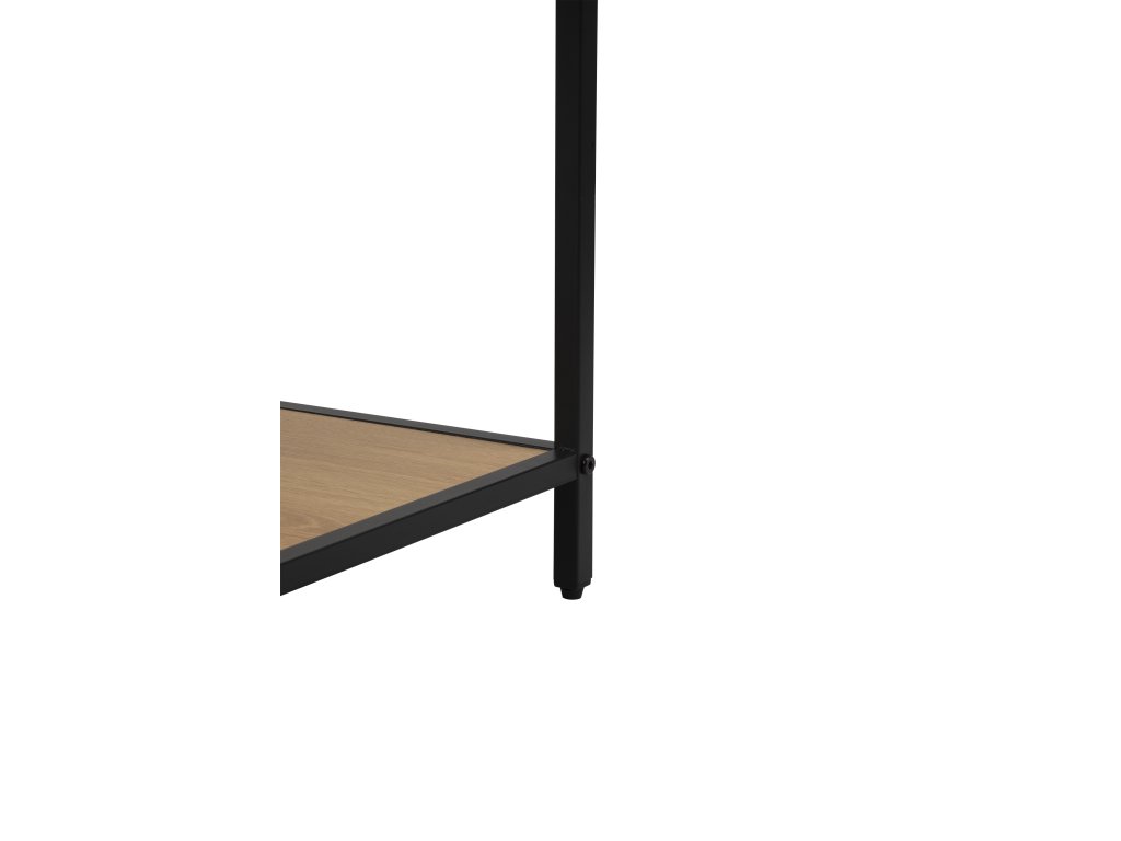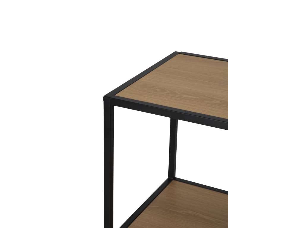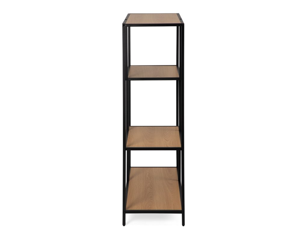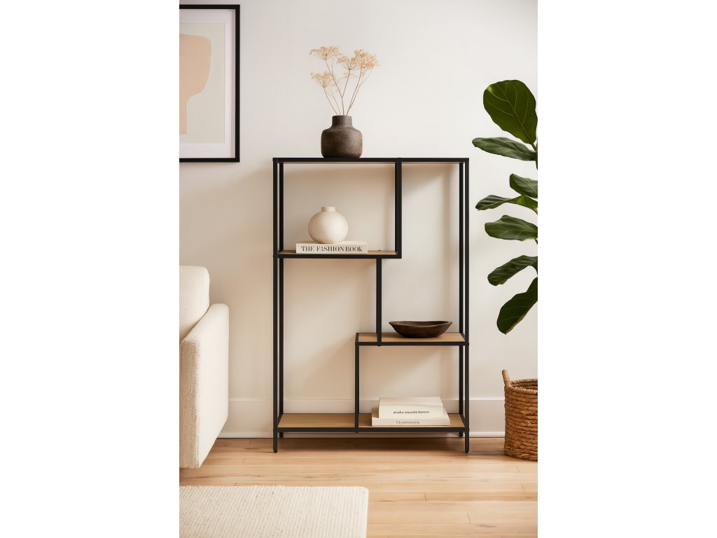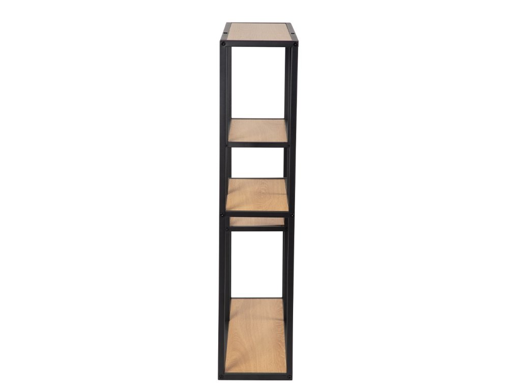 Čierna kovová konštrukcia zaisťuje stabilitu, zatiaľ čo laminované police sú ľahko udržiavateľné a odolné voči bežnému používaniu. Regál sa hodí do obývacej izby, pracovne alebo vstupného priestoru. Vďaka otvorenému prevedeniu nebráni svetlu a pomáha interiér opticky nezaťažiť.