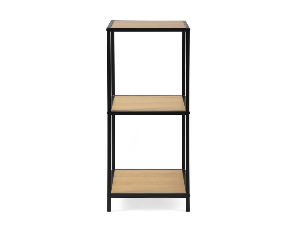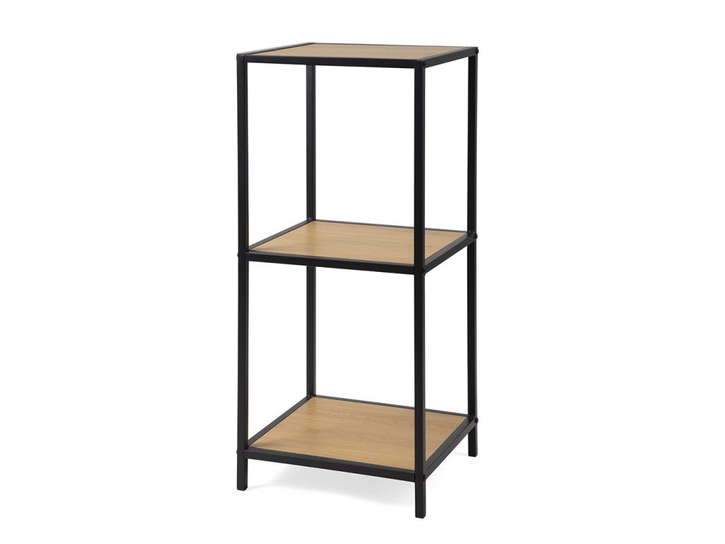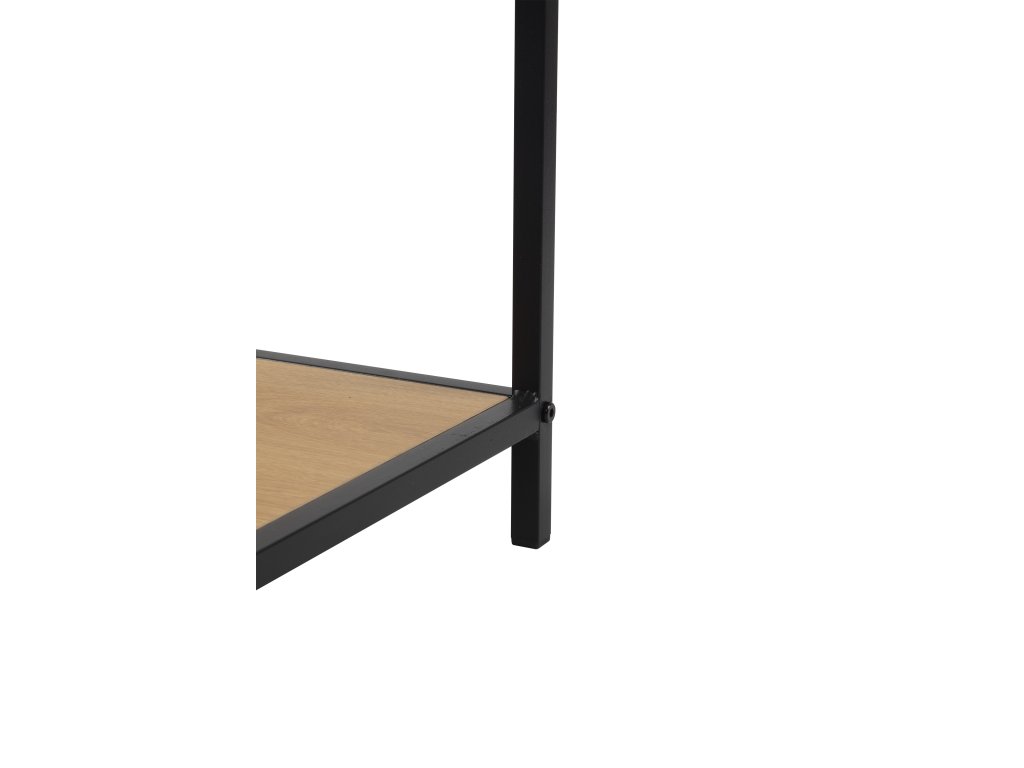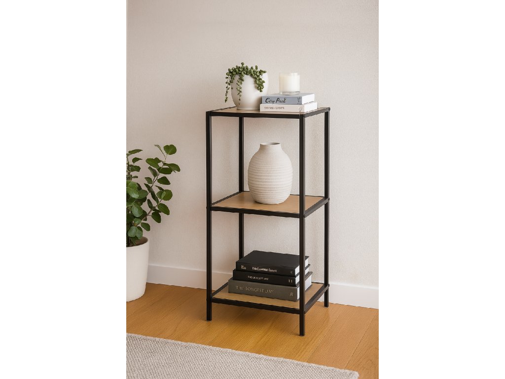 Čierna kovová konštrukcia zaisťuje stabilitu, zatiaľ čo laminované police sú ľahko udržiavateľné a odolné voči bežnému používaniu. Regál sa hodí do obývacej izby, pracovne alebo vstupného priestoru. Určite oceníte vzdušné otvorené prevedenie, ktoré nebráni svetlu.