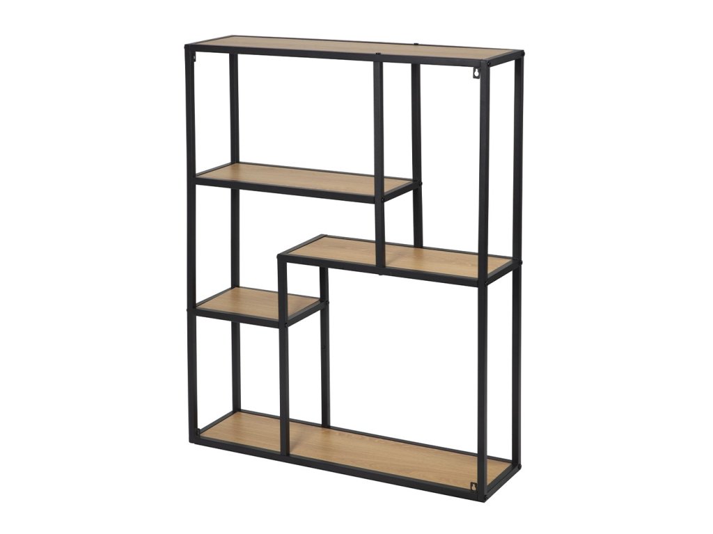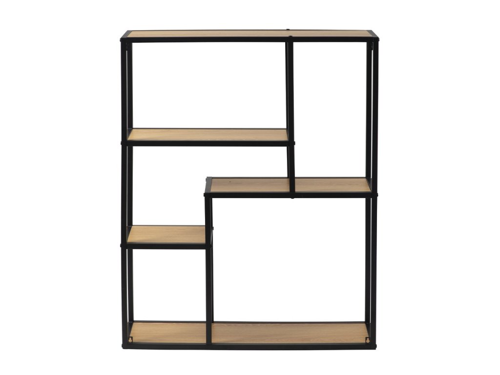 Praktický otvorený regál s kovovým rámom a policami v dekore prírodného dreva ponúka funkčný úložný priestor s odľahčeným vzhľadom. Vďaka asymetrickému rozloženiu políc pôsobí zaujímavo a zároveň poskytuje miesto na knihy, dekorácie alebo doplnky.
