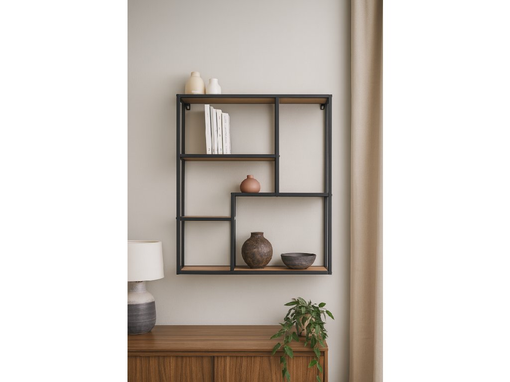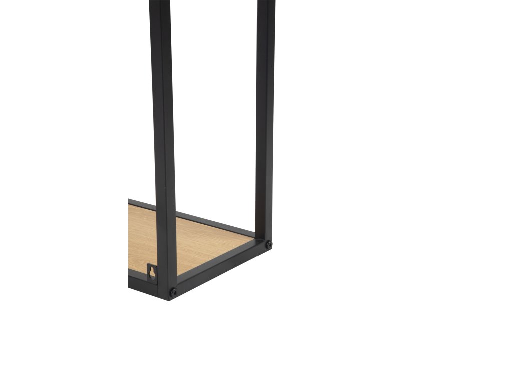 Čierna kovová konštrukcia zaisťuje stabilitu, zatiaľ čo laminované police sú ľahko udržiavateľné a odolné voči bežnému používaniu. Regál sa hodí do obývacej izby, pracovne alebo vstupného priestoru. Vďaka otvorenému prevedeniu nebráni svetlu a pomáha interiér opticky nezaťažiť.