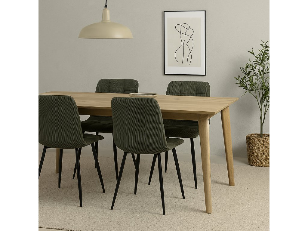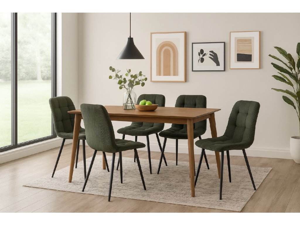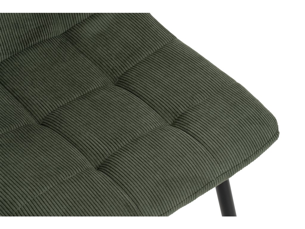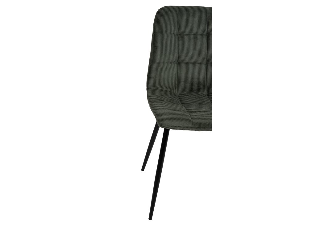 Moderná stolička Aria zaujme jednoduchým tvarom a pohodlným čalúnením zo zeleného menčestra. Kovové nohy v čiernej farbe dodávajú potrebnú stabilitu a ľahko sa kombinujú s rôznymi typmi stolov. Sedák je vyrobený z 9 mm preglejky a vrstvy peny 22 kg/m s čalúnením z menčestrovej látky. Jej nosnosť je až 120 kg.