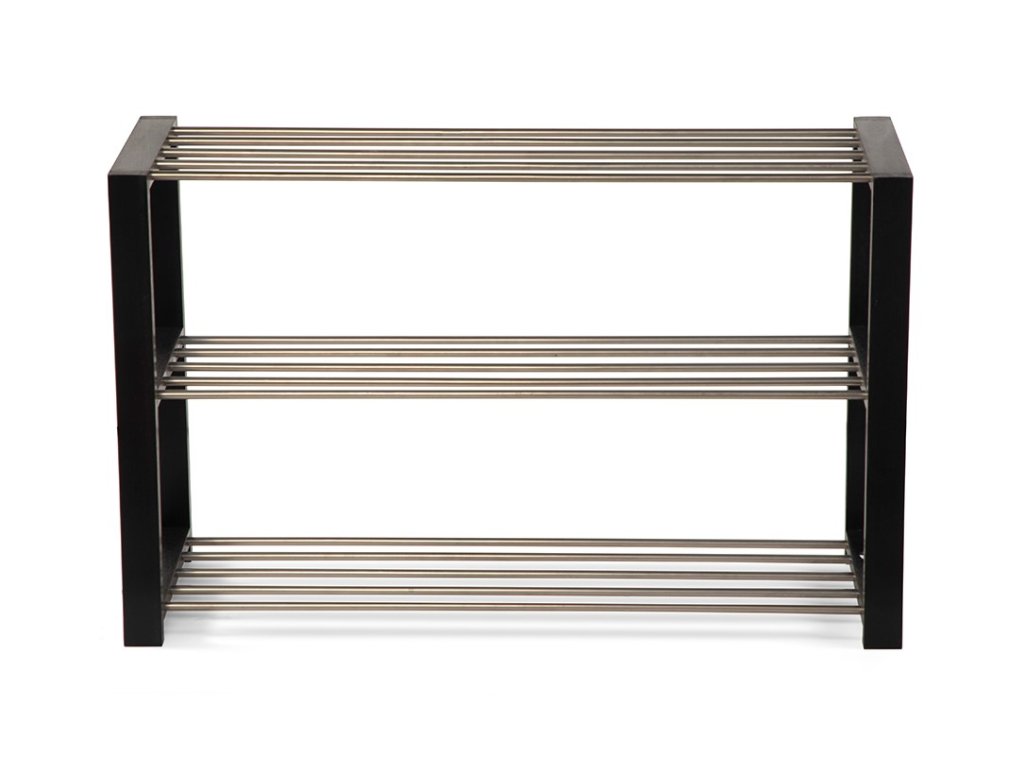 Botník s oceľovou konštrukciou v čiernej farbe a oceľovými tyčami v striebornej farbe.