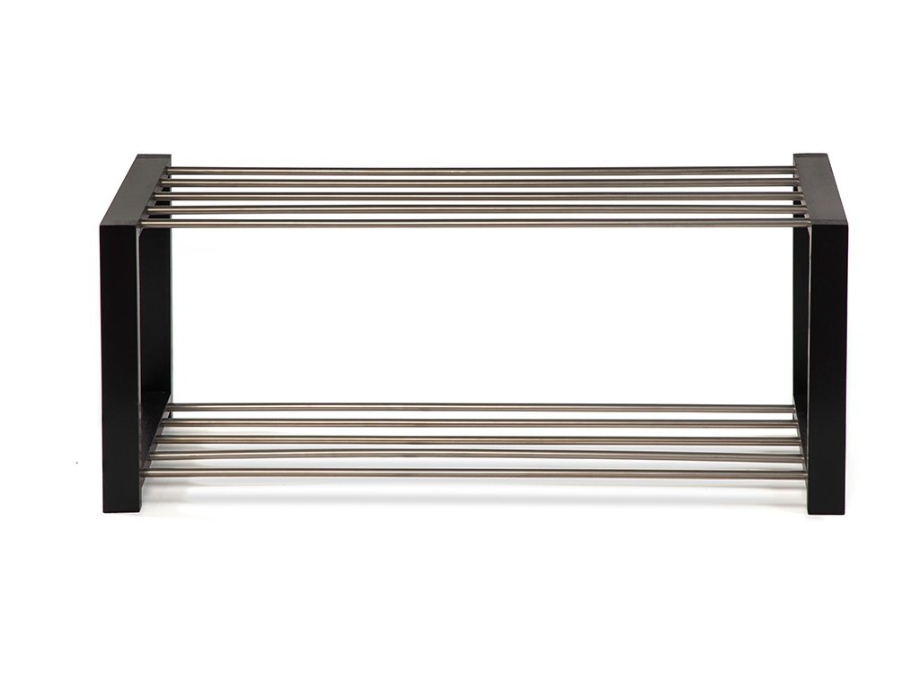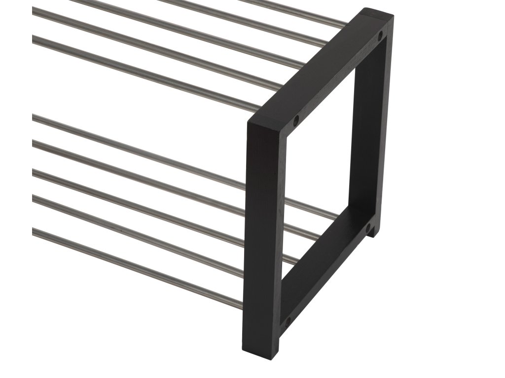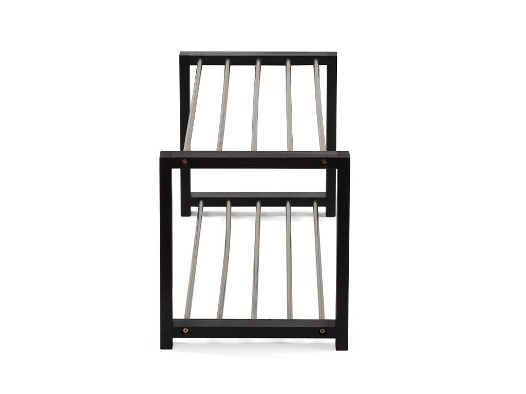 Botník s oceľovou konštrukciou v čiernej farbe a oceľovými tyčami v striebornej farbe.