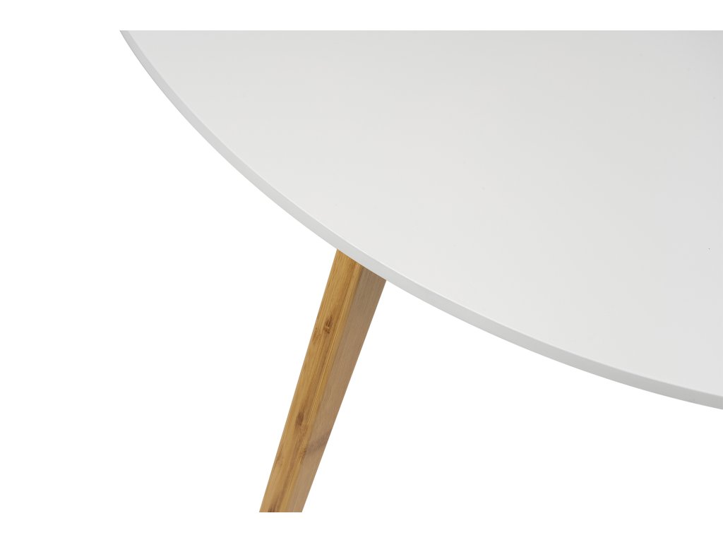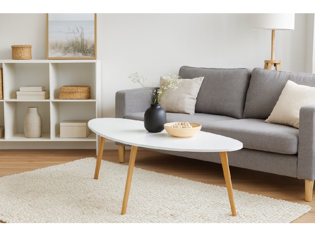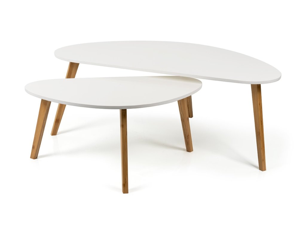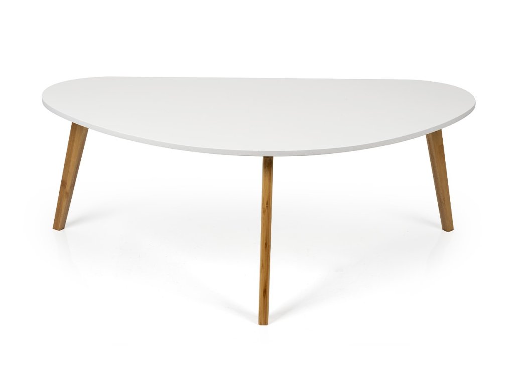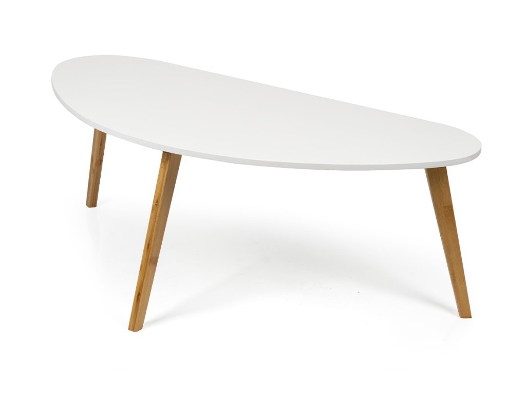 Moderný konferenčný stolík s originálnym tvarom stolovej dosky z MDF. Biela stolová doska pôsobí čisto a elegantne. Stabilné bambusové nohy z prírodného dreva dodávajú teplý a škandinávsky vzhľad. Vhodný do obývacej izby či modernej pracovne.