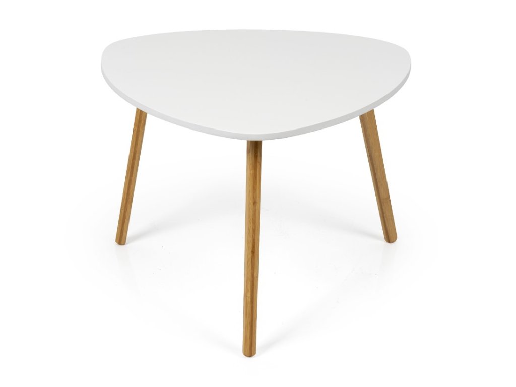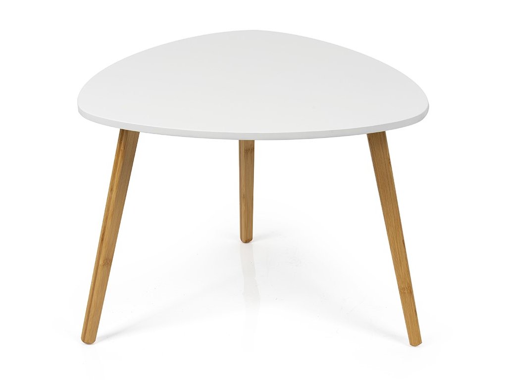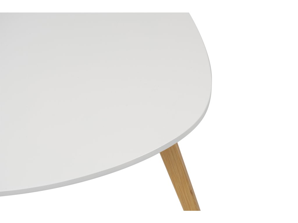 Moderný konferenčný stolík s originálnym tvarom stolovej dosky z MDF. Biela stolová doska pôsobí čisto a elegantne. Stabilné bambusové nohy z prírodného dreva dodávajú teplý a škandinávsky vzhľad. Vhodný do obývacej izby či modernej pracovne.