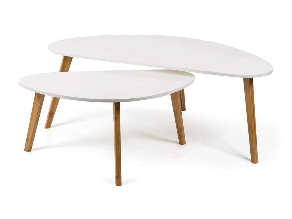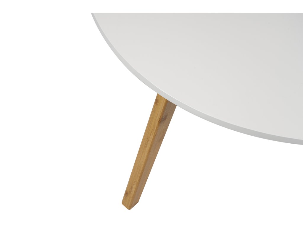 Moderný konferenčný stolík s originálnym tvarom stolovej dosky z MDF. Biela stolová doska pôsobí čisto a elegantne. Stabilné bambusové nohy z prírodného dreva dodávajú teplý a škandinávsky vzhľad. Vhodný do obývacej izby či modernej pracovne.