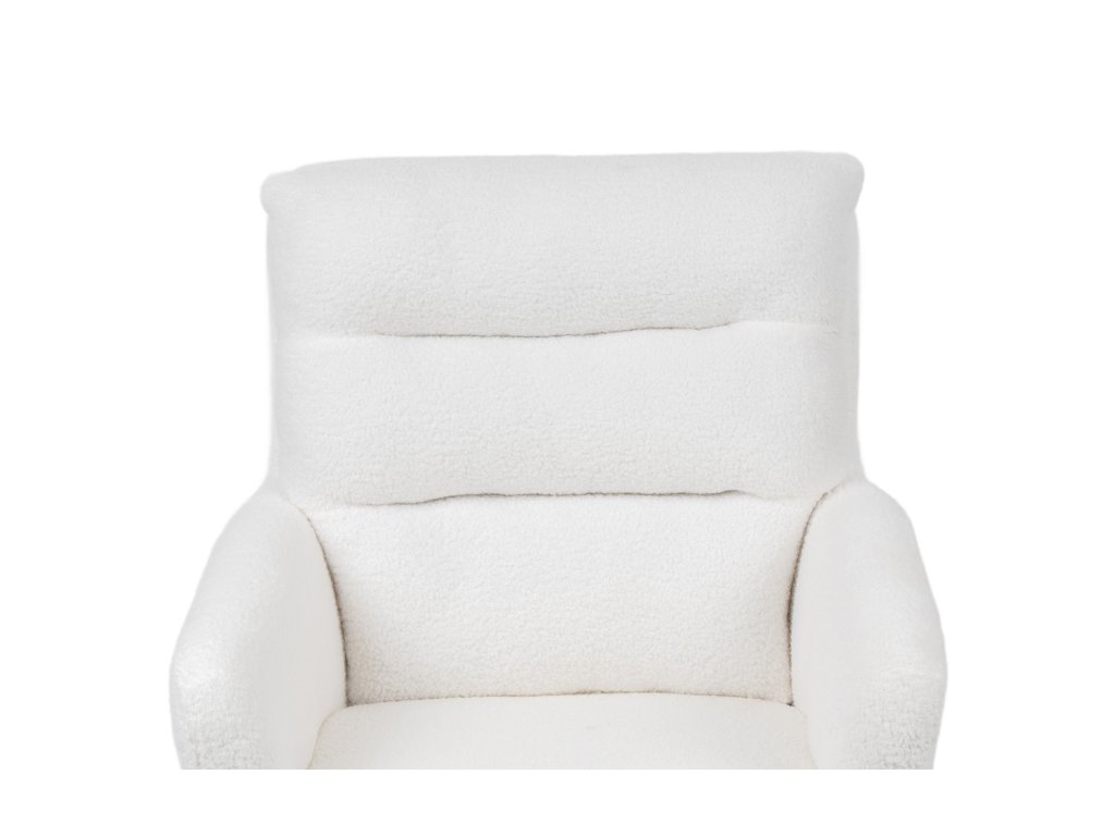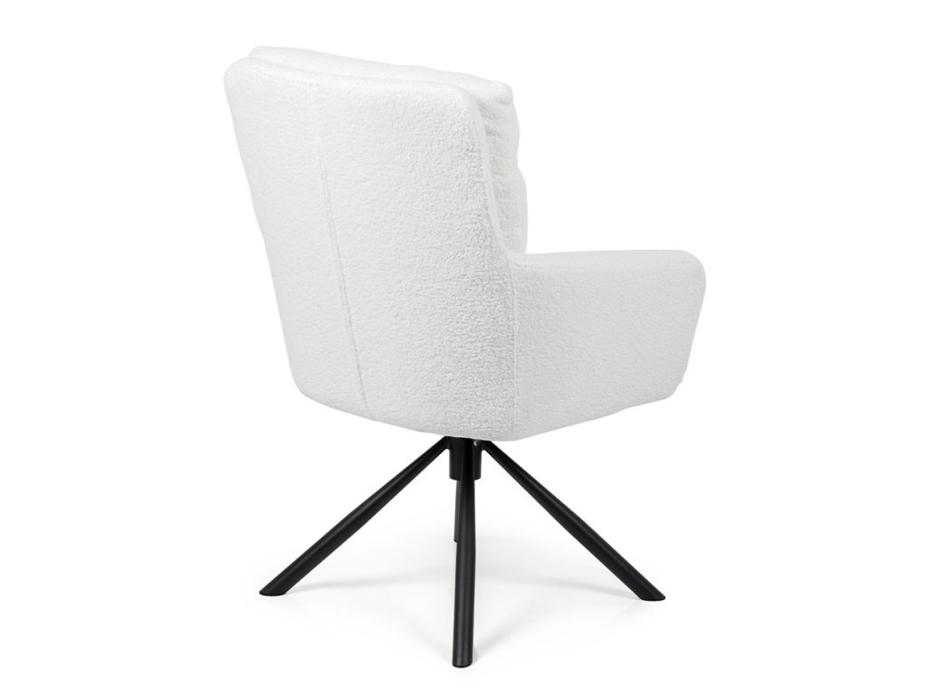 Moderná stolička s podrúčkami zaujme svojim elegantným vzhľadom. Vaše pohodlie zaručí komfortné čalúnenie z bielej bouclé látky s mäkkým polstrovaním. Pevná kovová podnož v čiernej farbe s otočnou funkciou zaistí patričnú stabilitu. Nosnosť je až 120 kg. Stoličku využijete ako jedálenskú stoličku k vášmu jedálenskému stolu alebo kdekoľvek inde v interiéri. Skvele sa hodí do jedálne, pracovne aj kancelárie.