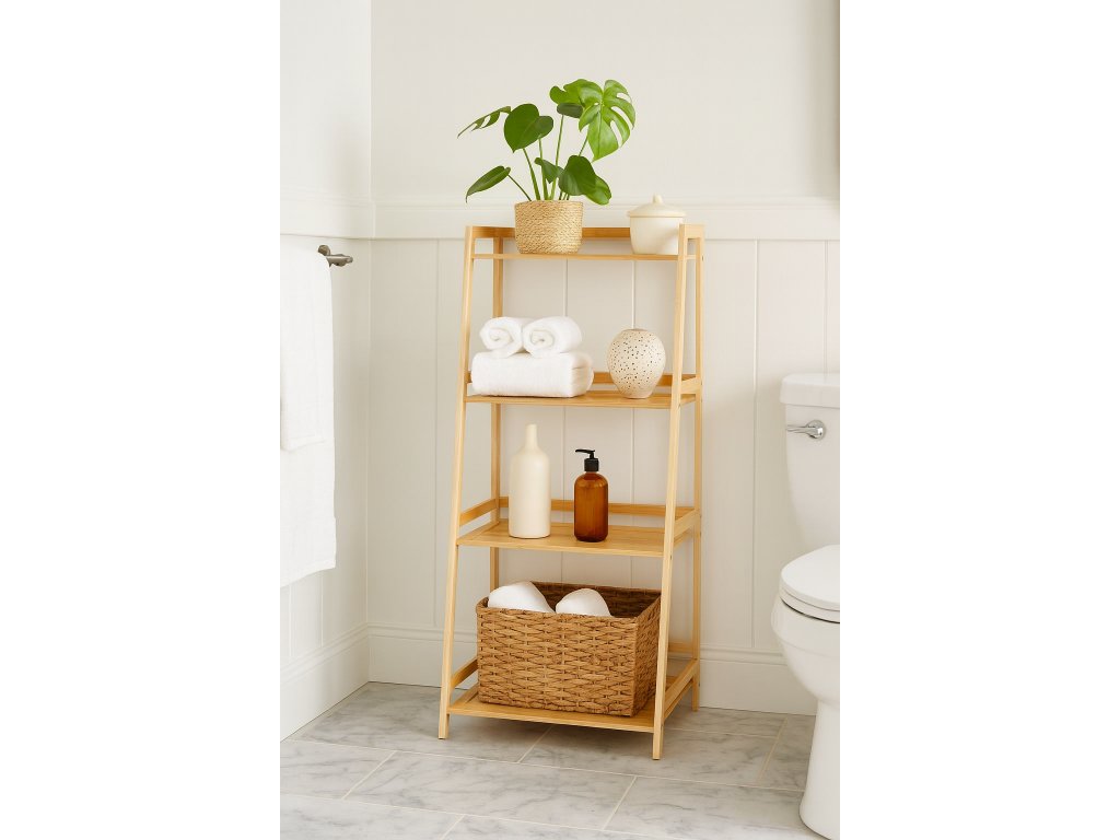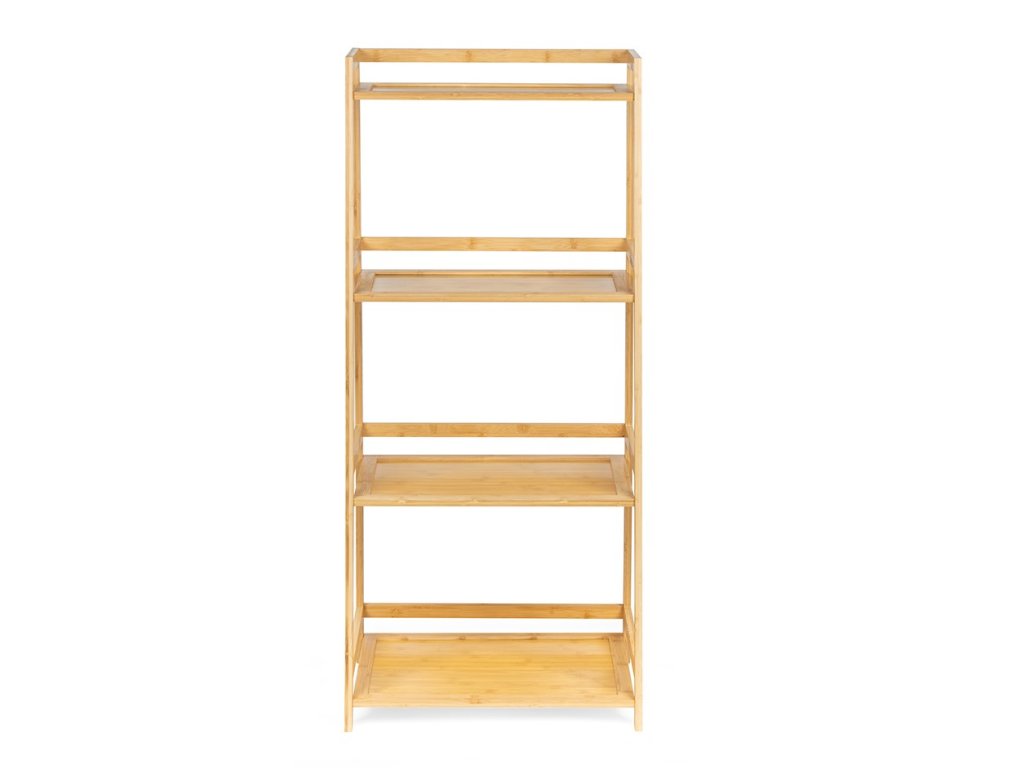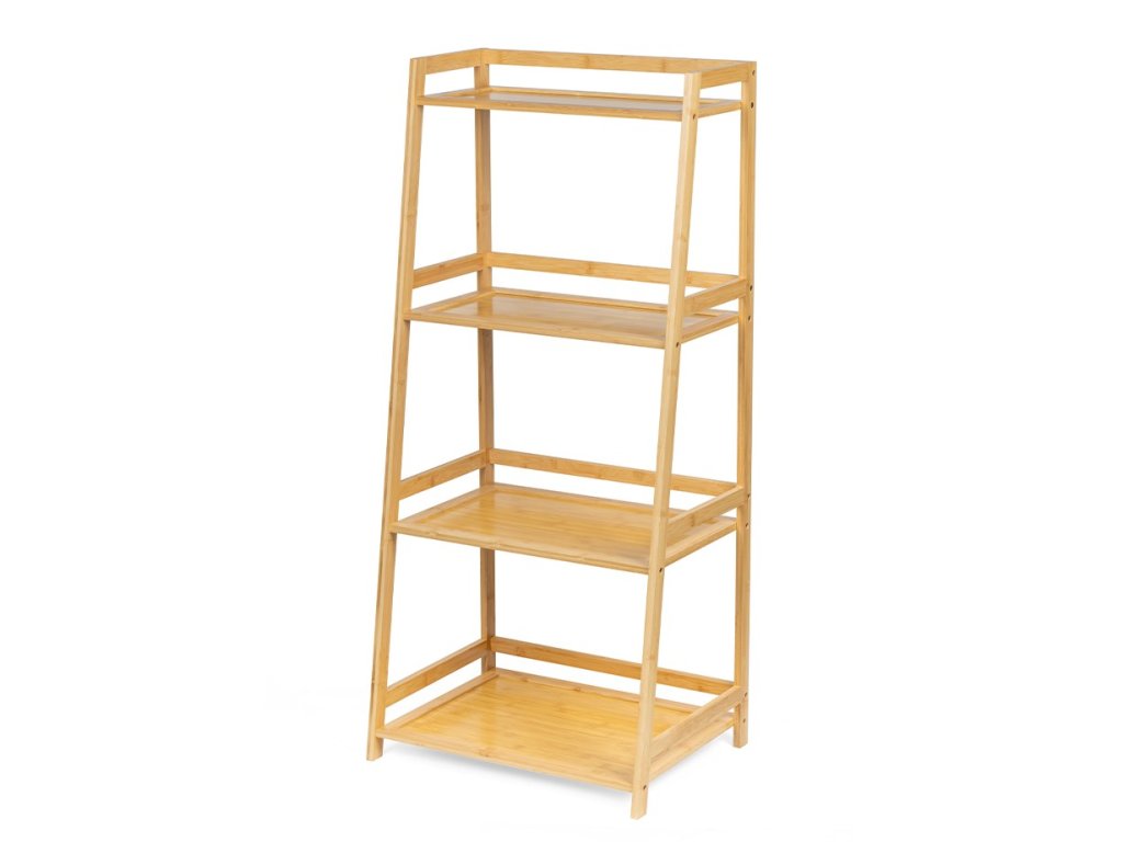 Štýlový policový diel so štyrmi úložnými policami. Vyrobený z pevného a odolného bambusu. Stupňovitá konštrukcia s miernym sklonom pôsobí moderne a odľahčene. Priestranné police vhodné na knihy, dekorácie, rastliny či kúpeľňové doplnky. Univerzálne využitie v obývacej izbe, kuchyni, spálni aj kúpeľni. Jednoduchý a funkčný design, ktorý sa hodí do rôznych interiérov.