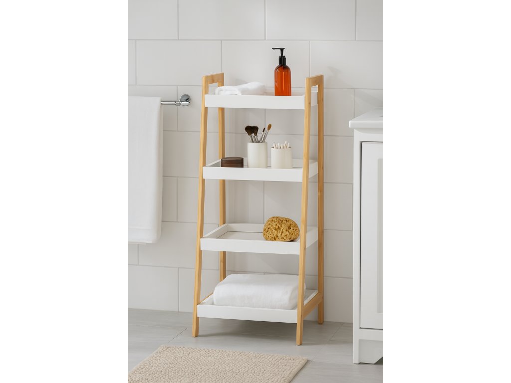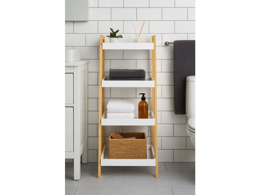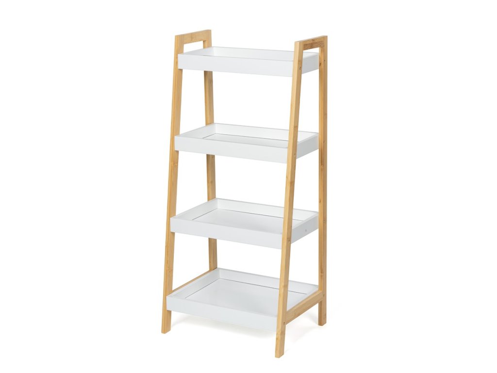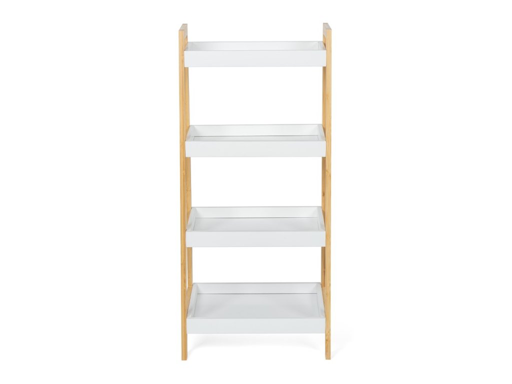 Dizajnový policový diel so štyrmi hlbšími policami v tvare tácok. Rám z prírodného bambusu dodáva stabilitu a moderný vzhľad. Biele police s vyvýšenými okrajmi bránia predmetom vypadnutia. Praktické riešenie na uloženie dekorácií, kníh, uterákov alebo rastlín. Vďaka skosenej konštrukcii pôsobí odľahčene a zapadne do moderných interiérov. Vhodný do obývacej izby, kúpeľne, spálne aj predsiene.