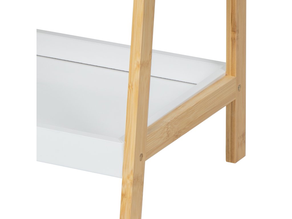 Skosený bambusový regál s bielymi policami o rozmere 39x29x85 cm.
