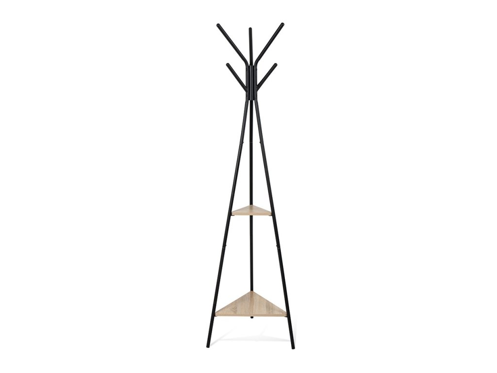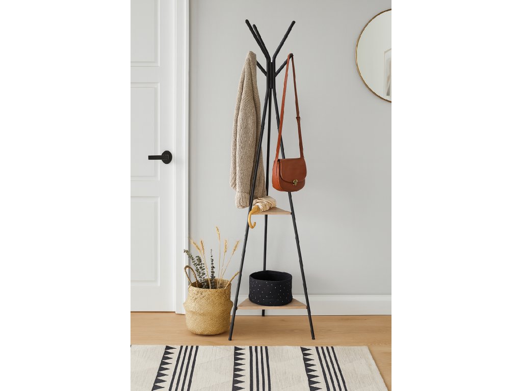 Kovový vešiak v čiernej farbe s poličkou z preglejky v prírodnej farbe.