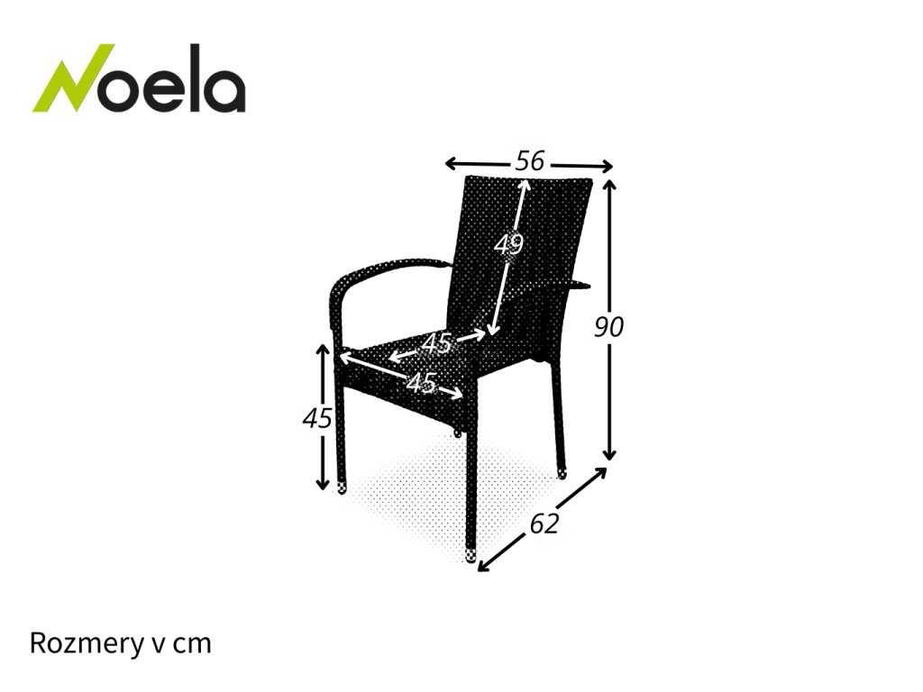Stolička disponuje opierkou chrbta s dĺžkou 49 cm. Sedák s rozmermi 45 cm x 45 cm (Hĺbka x Šírka) vo výške 45 cm od zeme.