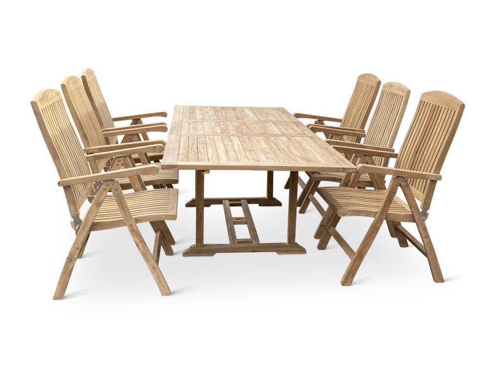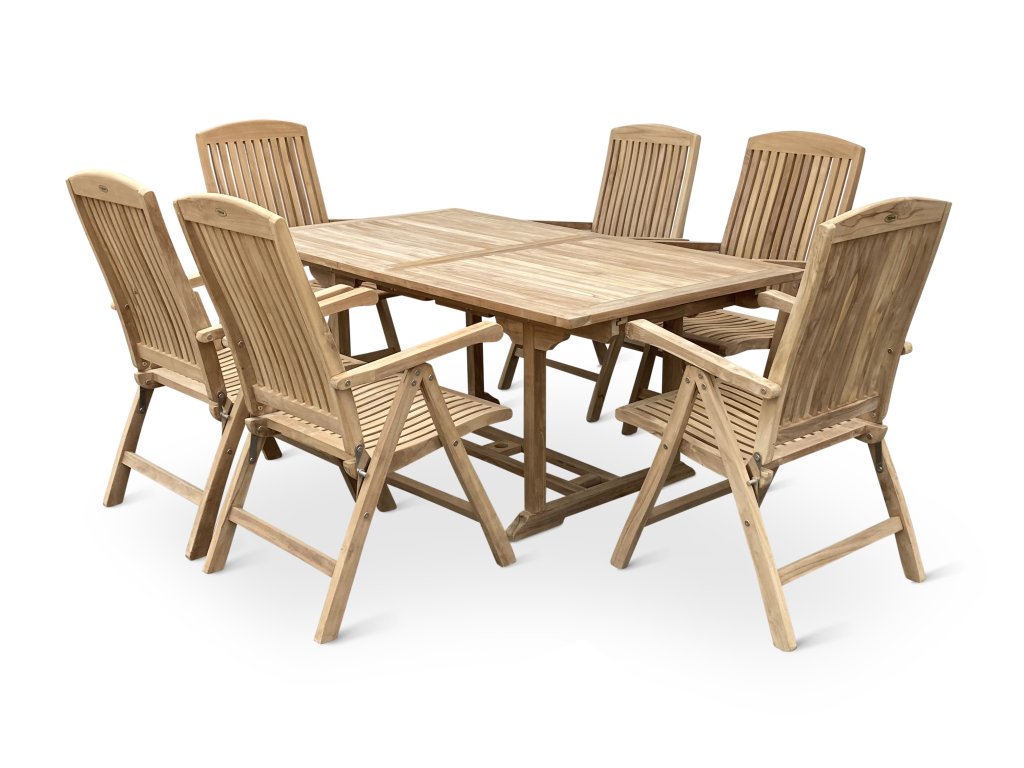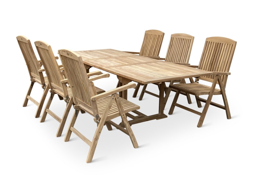 Záhradný rozkladací stôl hranatý Faisal a 6 Drevených polohovateľných stoličiek America I. tvoria dohromady naozaj luxusnú zostavu nábytku pre Vašu záhradu.