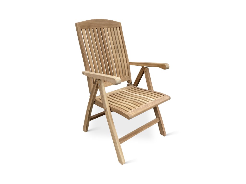 Záhradný stôl dopĺňa 6 polohovacích drevených stoličiek z vysoko odolného materiálu teak. Stolička je anatomicky tvarovaná. Široké podrúčky pre pohodlné sedenie a rýchla možnosť zloženia pre potrebu uloženia. Vysokú chrbtovú opierku záhradnej stoličky America si môžete podľa potreby nastaviť až do 7 polôh. Nosnosť je až 130 kg.