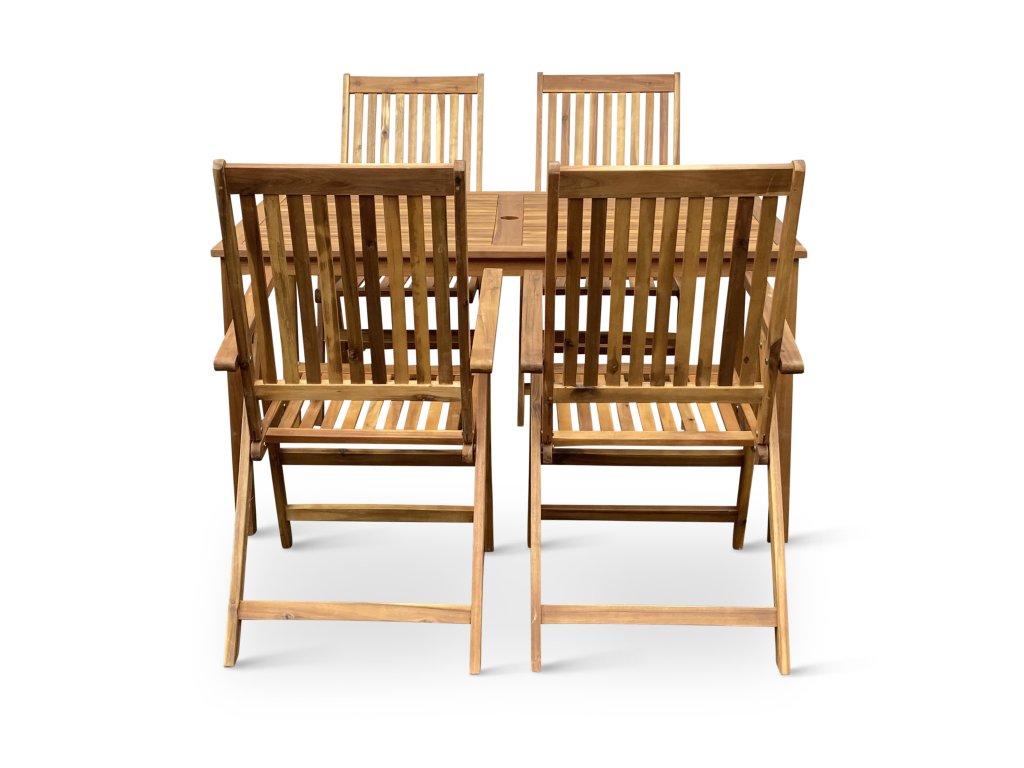 Záhradný stôl dopĺňa polohovacia a skladacia stolička Viet s podrúčkami, ktorá je tiež vyrobená z akáciového dreva. Vysokú chrbtovú opierku si ľahko nastavíte do pohodlnej pozície. V zloženom stave stoličku jednoducho uskladníte. Nosnosť je 100 kg.