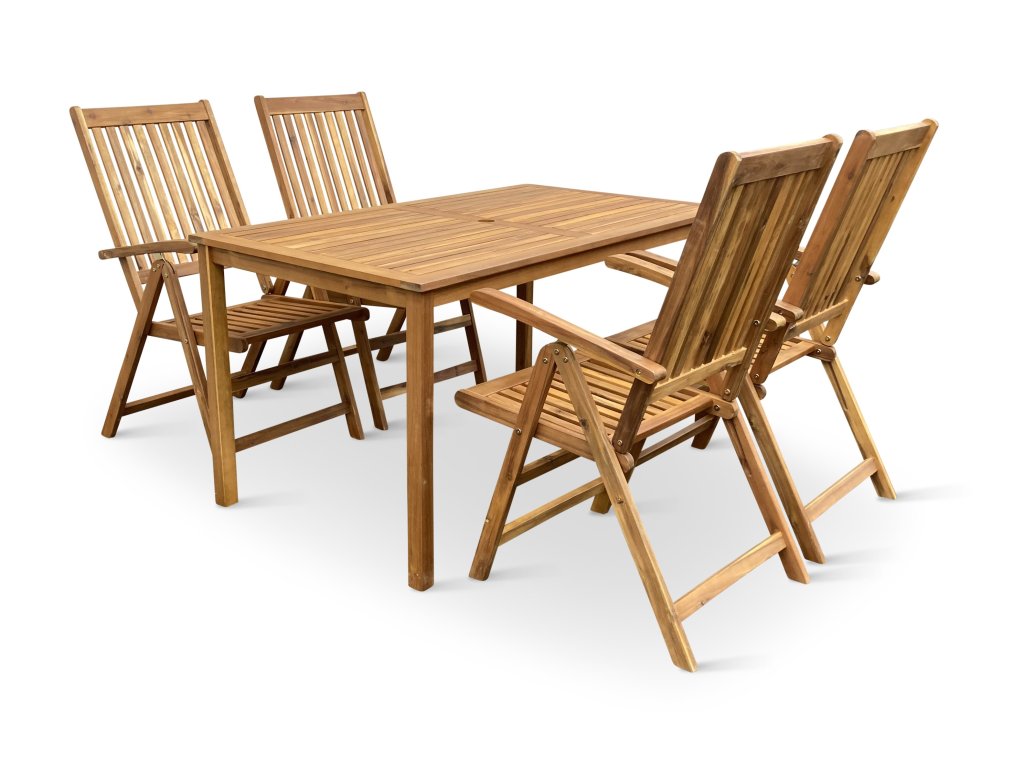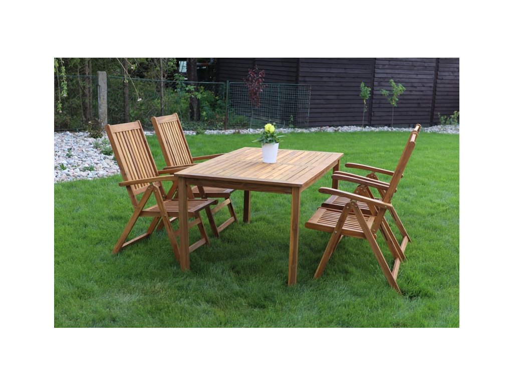 Záhradnú jedálenskú zostavu z akácie tvorí Záhradný drevený stôl LUCY a 4 Drevené polohovacie stoličky Viet.