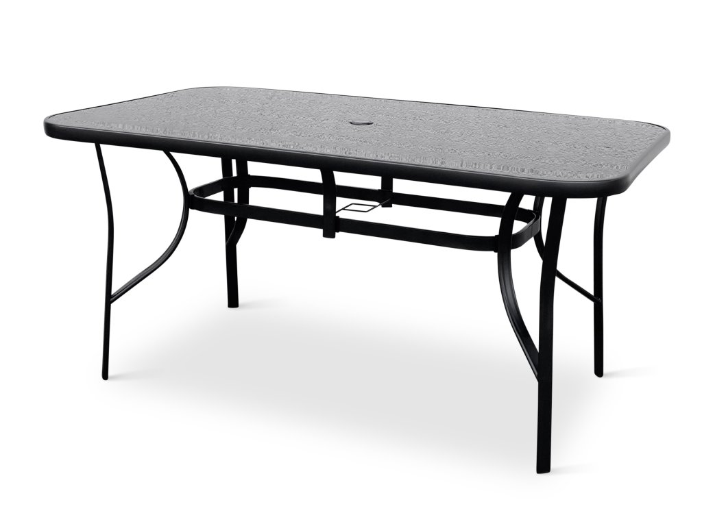 Zostava zahŕňa stabilný stôl s kovovou konštrukciou z ocele a sklenenou doskou. Doska stola vyrobená z čierneho tvrdeného skla disponuje otvorom pre slnečník s priemerom 4,5 cm. Stôl dodávame vrátane plastovej záslepky pre prípad, kedy otvor pre slnečník nebudete využívať. Kovové časti stola boli ošetrené proti hrdzi. Praktický stôl z takmer bezúdržbových umývateľných materiálov, ktorý svojím jednoduchým univerzálnym dizajnom zapadne do všetkých vonkajších priestorov.