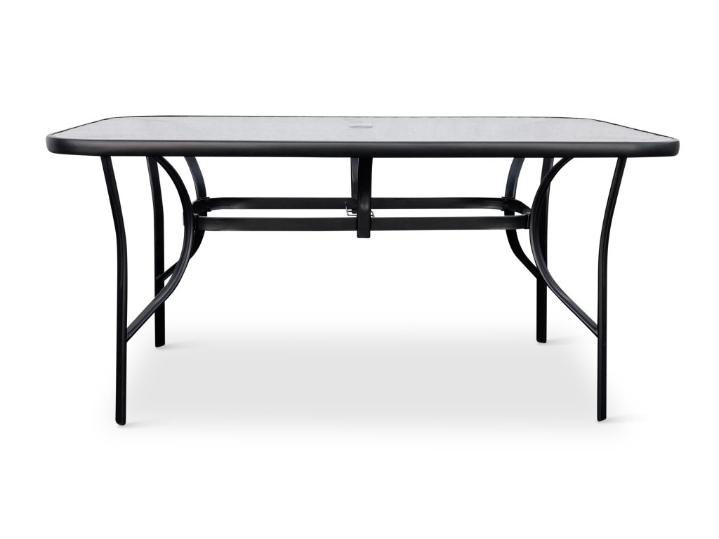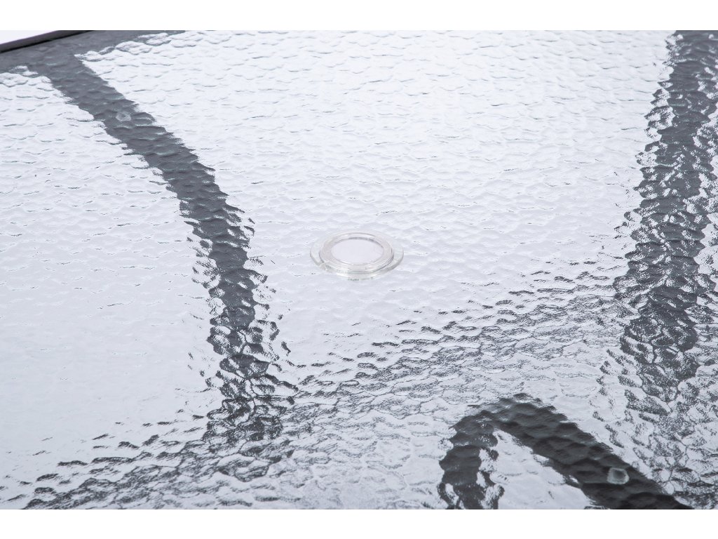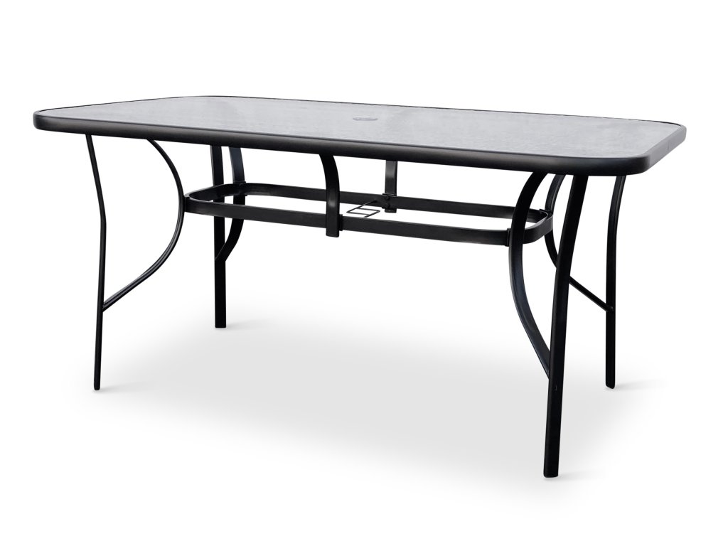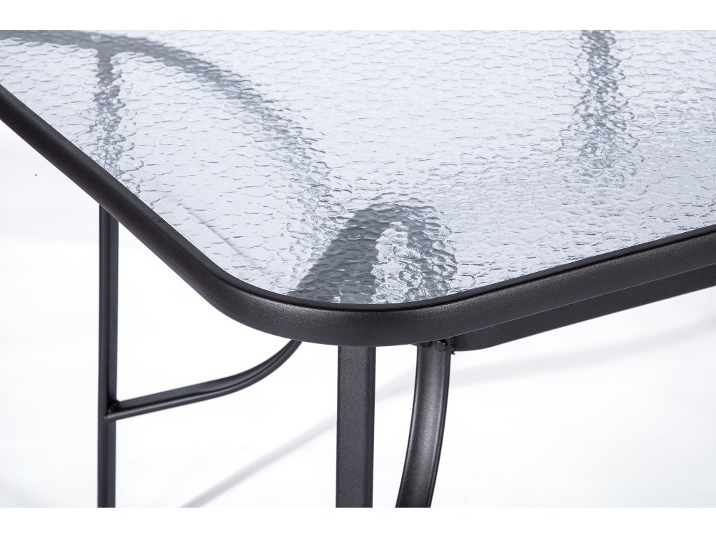 Zostava zahŕňa stabilný stôl s kovovou konštrukciou z ocele a sklenenou doskou. Doska stola vyrobená z priehľadného tvrdeného skla disponuje otvorom pre slnečník s priemerom 4,5 cm. Stôl dodávame vrátane plastovej záslepky pre prípad, kedy otvor pre slnečník nebudete využívať. Kovové časti stola boli ošetrené proti hrdzi. Praktický stôl z takmer bezúdržbových umývateľných materiálov, ktorý svojím jednoduchým univerzálnym dizajnom zapadne do všetkých vonkajších priestorov.