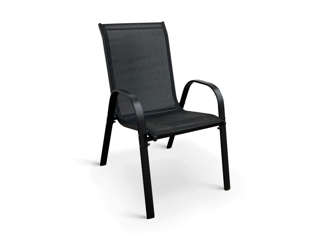 Jedálenský stôl dopĺňa komfortná záhradná stolička s oceľovou konštrukciou. Stolička je stohovateľná a takmer bezúdržbová. Sedadlo a chrbtovú opierku tvorí vzdušná textília a vďaka inteligentnému tvarovaniu je veľmi pohodlná. Stoličku dopĺňajú kovové podrúčky. Nosnosť činí až 130 kg. Vhodná pre nekomerčné použitie. Pre dlhšiu životnosť odporúčame neskladovať vo vlhkých priestoroch a nenechávať na daždi.