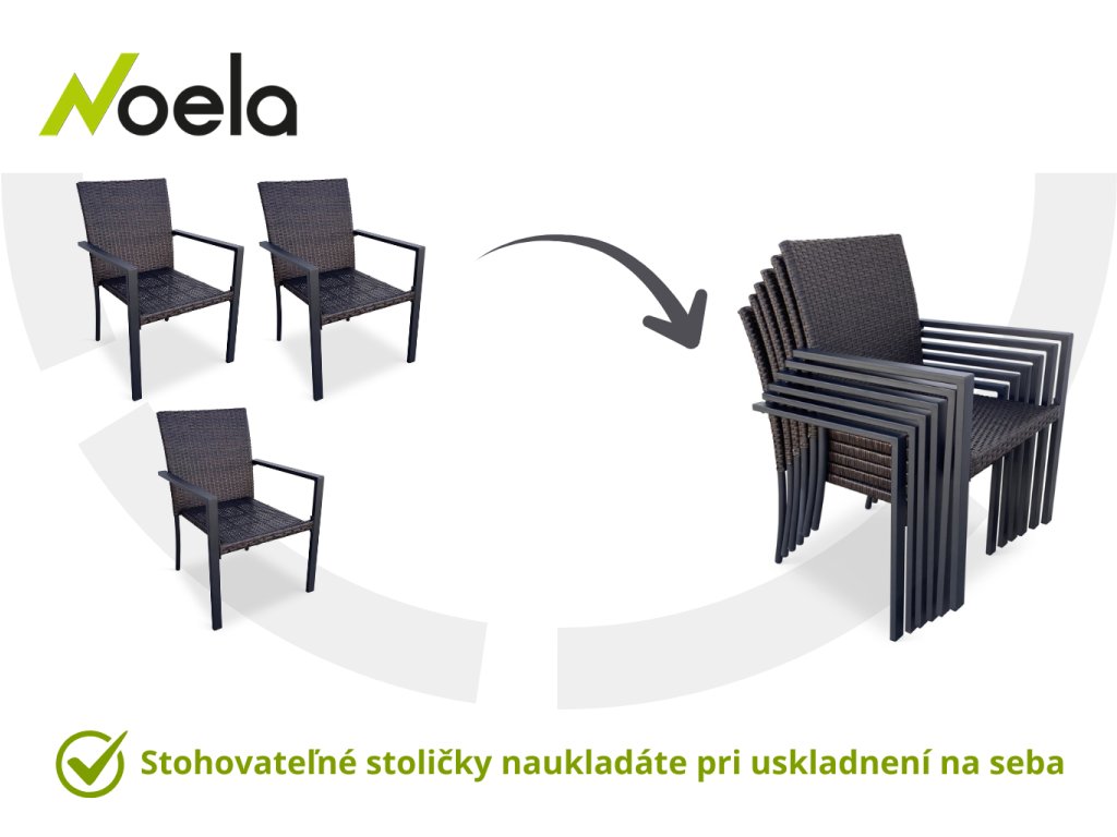 Jedálenský stôl dopĺňa pohodlná záhradná stolička s oceľovou konštrukciou. Kombinácia sedadla a opierky z umelého ratanu v tmavo hnedej farbe a hranatých podrúčiek z kovu tvoria dohromady modernú a praktickú záhradnú stoličku. Stolička je stohovateľná, takmer bezúdržbová a má vystužený sedák, ktorý unesie ťažšie váhy aj po dlhšiu dobu. Stolička disponuje najväčším sedákom v kategórii záhradných stoličiek z umelého ratanu s veľkorysými rozmermi 49 x 48 cm. Hĺbka sedadla je 49 cm a šírka medzi podrúčkami 48 cm. Nosnosť je až 130 kg! Stolička je vyrobená z umelého ratanu, ktorý je skvelou voľbou do slovenských poveternostných podmienok. Nevadí mu dážď, mráz, vietor ani slnko.