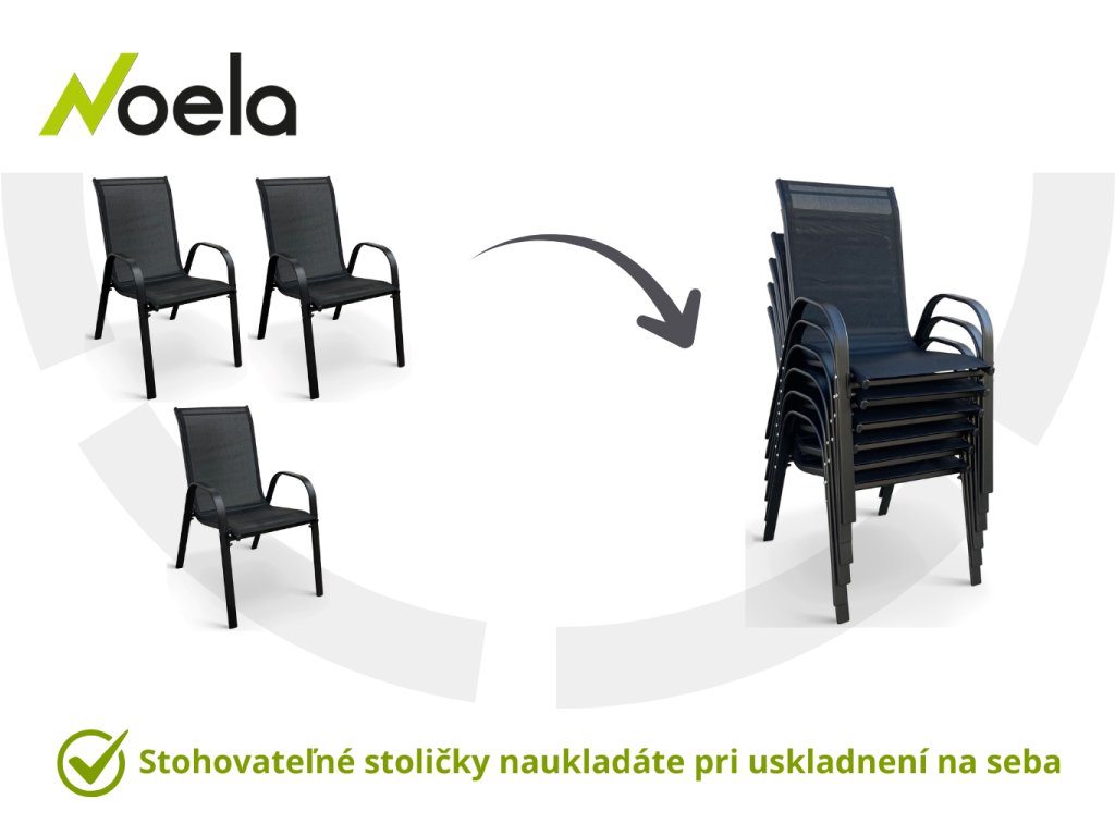 Jedálenský stôl dopĺňa komfortná záhradná stolička s oceľovou konštrukciou. Stolička je stohovateľná a takmer bezúdržbová. Sedák a chrbtovú opierku tvorí vzdušná textília a vďaka inteligentnému tvarovaniu je veľmi pohodlná. Stoličku dopĺňajú kovové podrúčky. Nosnosť je až 130 kg. Vhodná pre nekomerčné použitie. Pre dlhšiu životnosť odporúčame neskladovať vo vlhkých priestoroch a nenechávať na daždi.