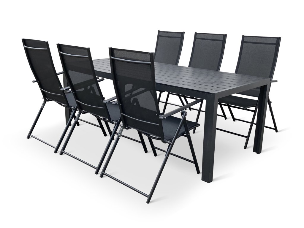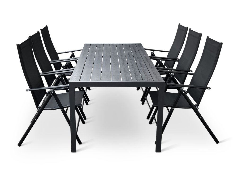 Zostavu tvorí Bezúdržbový kovový stôl Viking XL a 6 Polohovacích kovových stoličiek Pia.