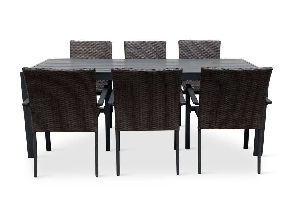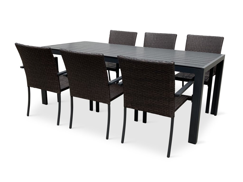 Zostavu tvorí Bezúdržbový kovový stôl Viking XL a 6 Záhradných ratanových stoličiek Wicker Pat.