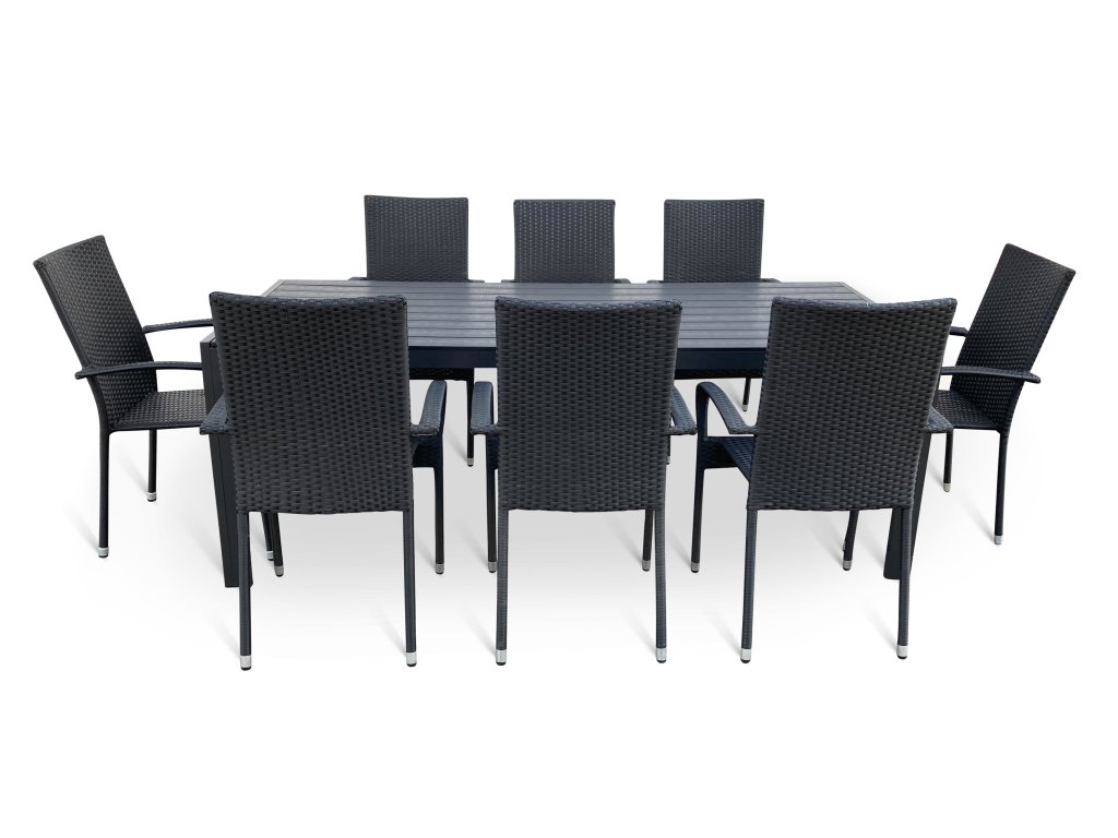 Zostavu tvorí Bezúdržbový kovový stôl Viking XL a 8 záhradných ratanových stoličiek Paris KD.