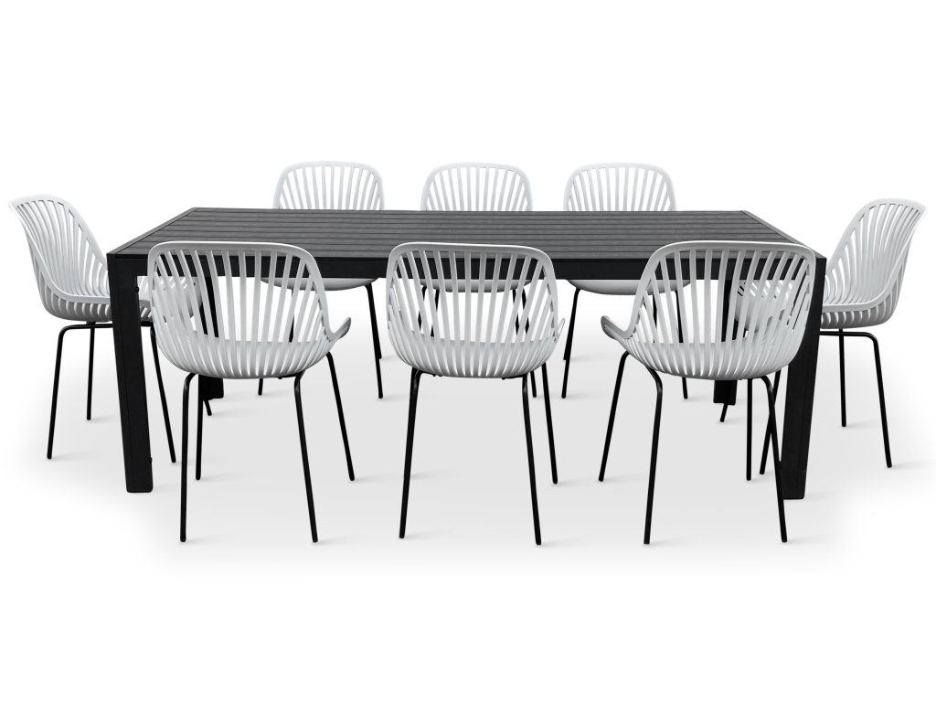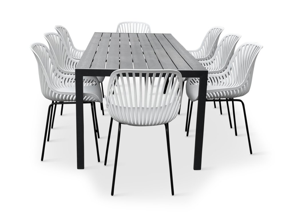 Zostavu tvorí Bezúdržbový kovový stôl Viking XL a 8 Dizajnových stoličiek GABY sivá.