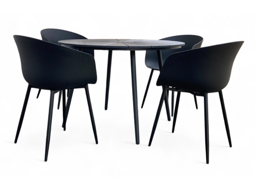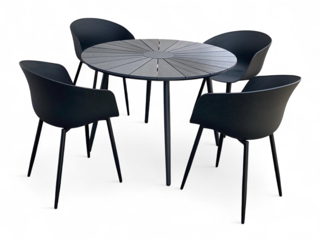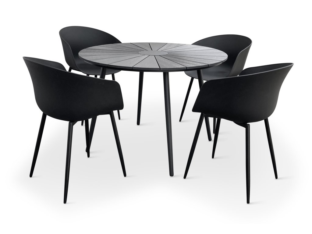 Zostavu tvorí Bezúdržbový okrúhly stôl Wilder 105cm a 4 Záhradné jedálenské stoličky Rikke.