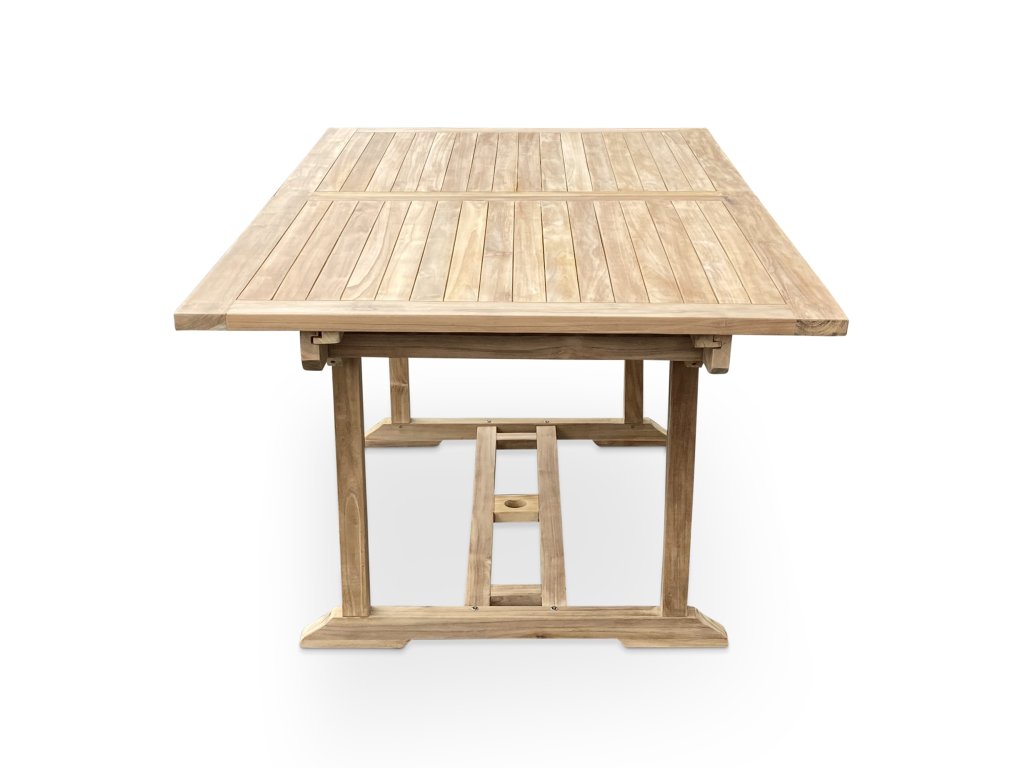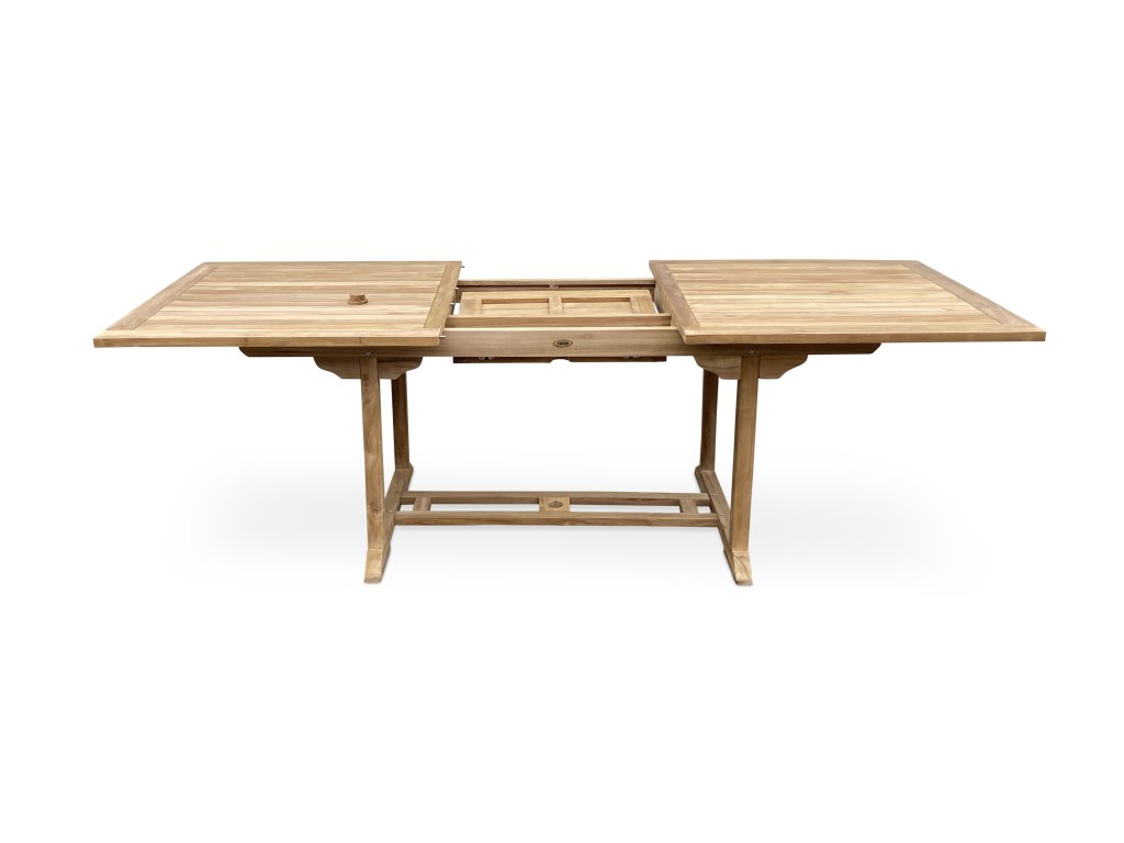 Komfortný obdĺžnikový stôl FAISAL z teakového dreva ponúka veľmi praktickú možnosť rozloženia stola a jeho predĺženie zo základnej dĺžky 200 cm na 240 cm. Túto variabilitu záhradného stola oceníte predovšetkým pri väčšej záhradnej párty, kedy je žiaduci väčší odkladací priestor na stole. Stôl disponuje otvorom pre slnečník s priemerom 5 cm. Dodávané vrátane drevenej záslepky. Kvalita teakového dreva, z ktorého je záhradný stôl FAISAL vyrobený, je jednoznačne špičková a stôl je dodávaný v prírodnom prevedení natural. Údržba teakového dreva nie je náročná. Stôl natierajte pravidelne teakovým olejom.