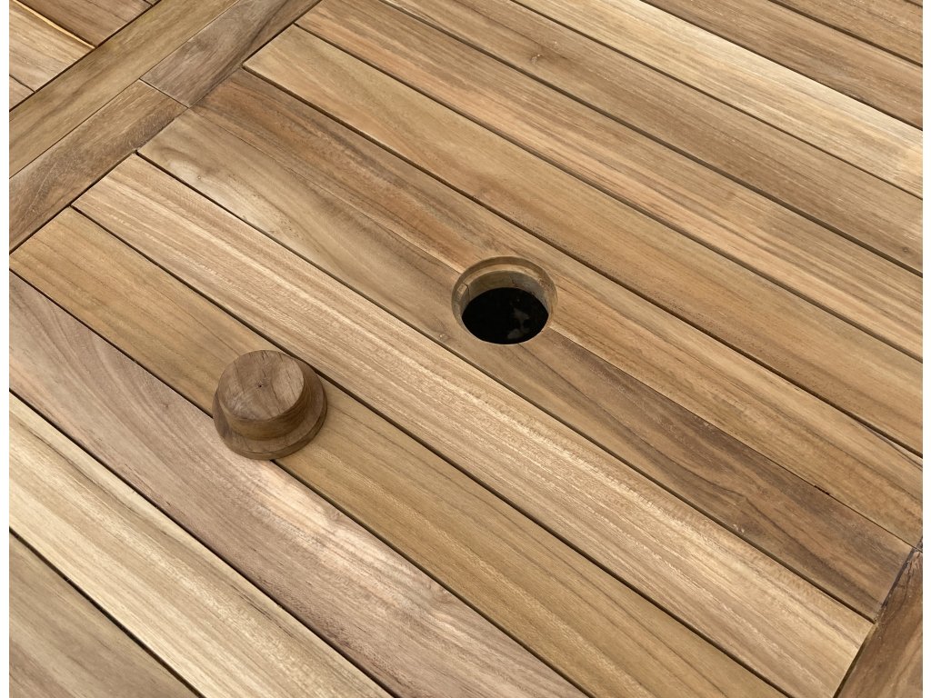 Sila materiálu (doska x noha) 2,7 cm x 4,5 cm. Otvor pre slnečník s priemerom 5 cm.